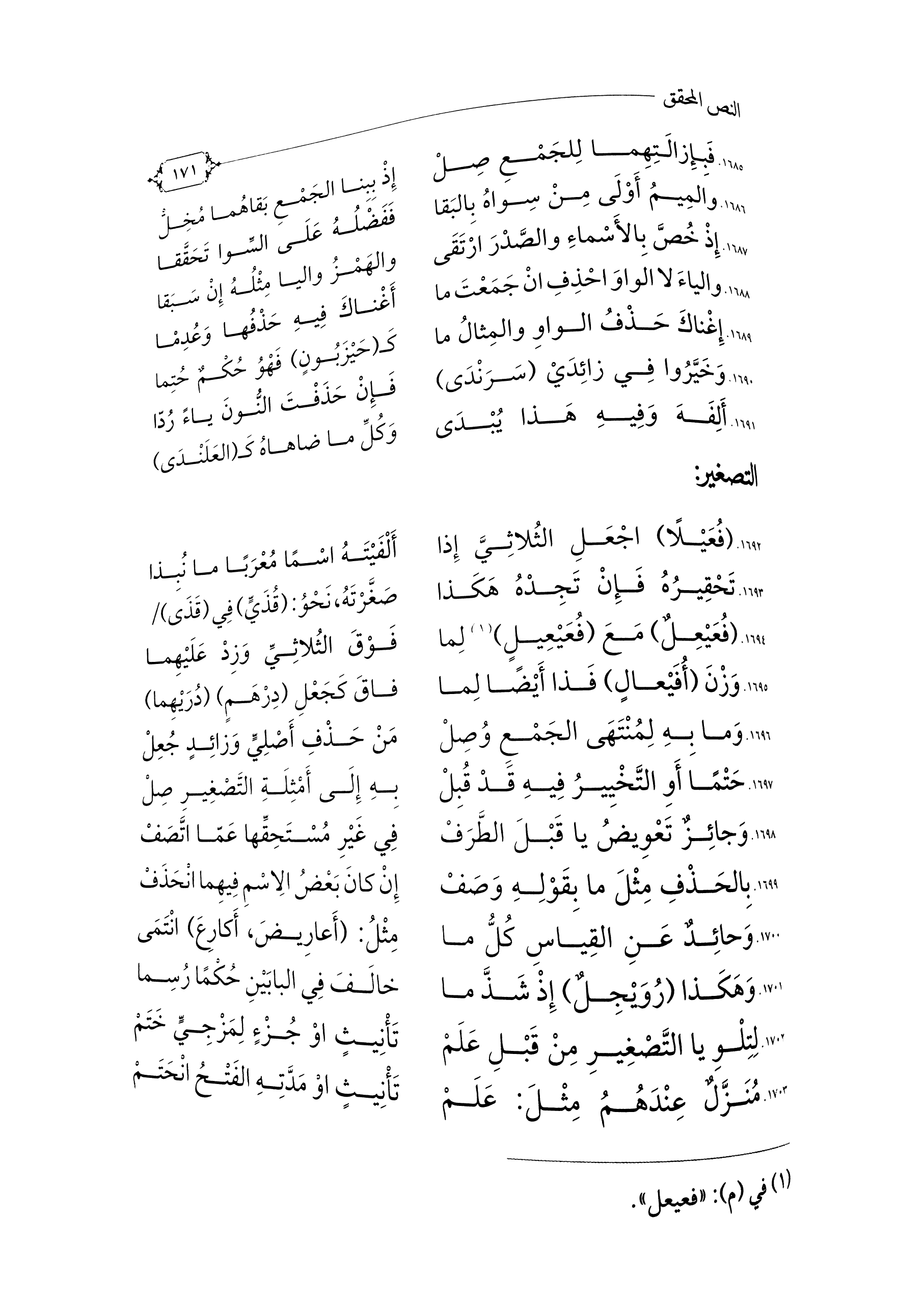 ١٧٠١. وَهَكَذَا (رُوَيْجِلٌ) إِذْ شَذَّ مَا ... خَالَفَ فِي البَابَيْنِ حُكْمًا رُسِمَا ...