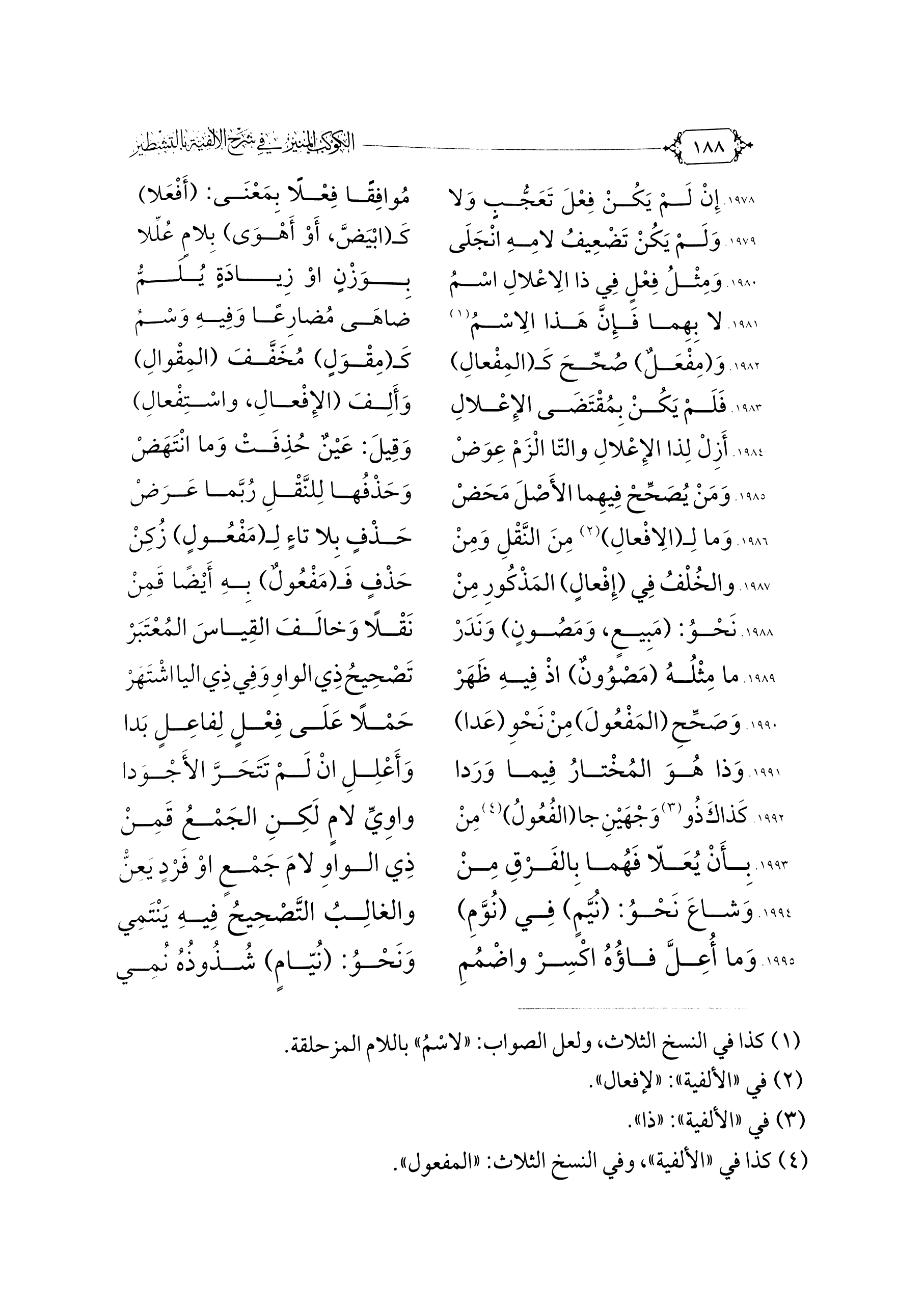١٩٨٨. نَحْوُ (مَبِيعٍ، وَمَصُونٍ) وَنَدَرْ ... نَقْلًا وَخَالَفَ القِيَاسَ المُعْتَبَرْ ...