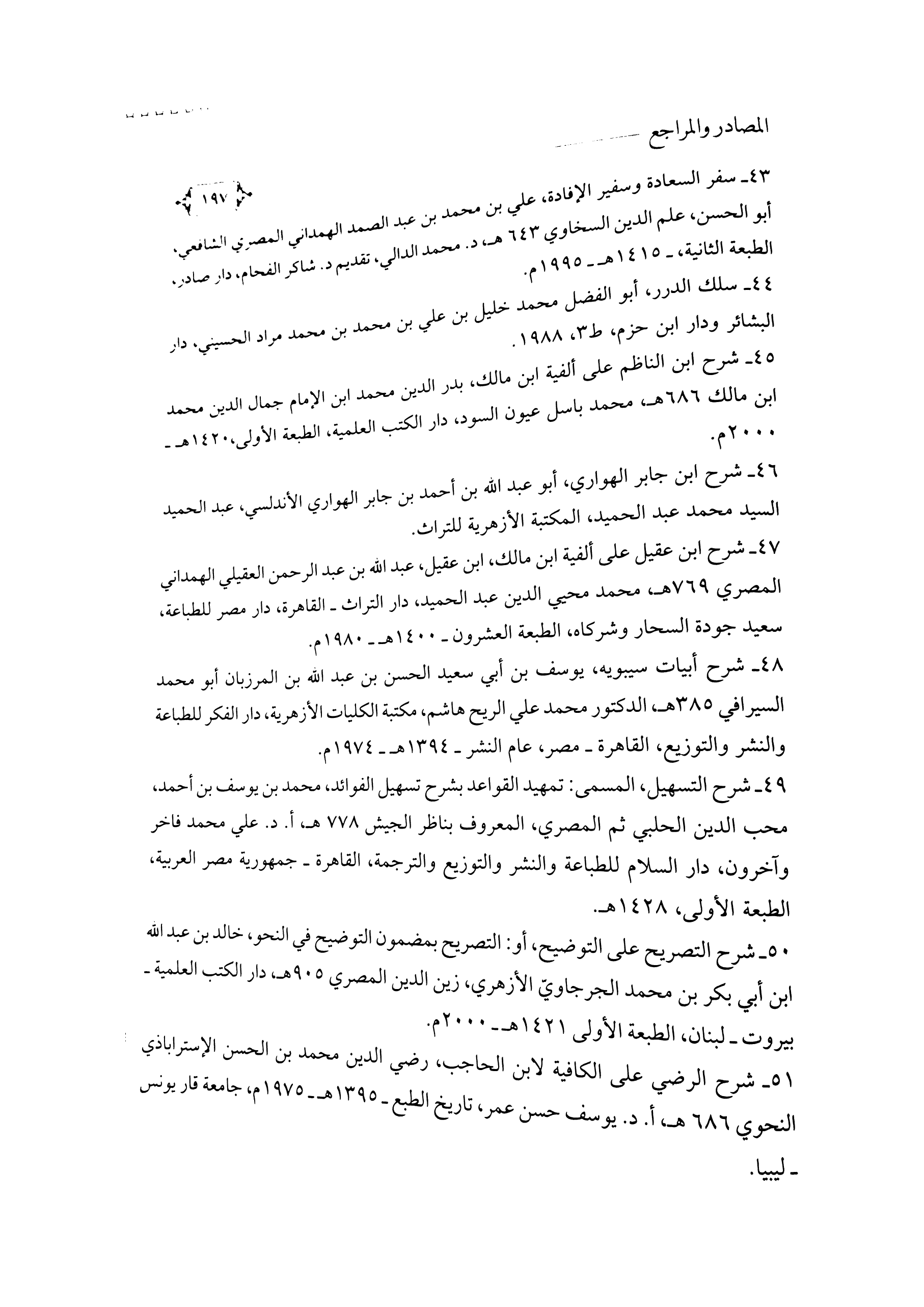 ٥٠. شرح التصريح على التوضيح أو التصريح بمضمون التوضيح في النحو، خالد بن عبد الله بن أبي بكر بن محمد الجرجاويّ الأزهري، زين الدين المصري ٩٠٥ هـ، دار الكتب العلمية -بيروت-لبنان، الطبعة الأولى ١٤٢١ هـ- ٢٠٠٠ م.