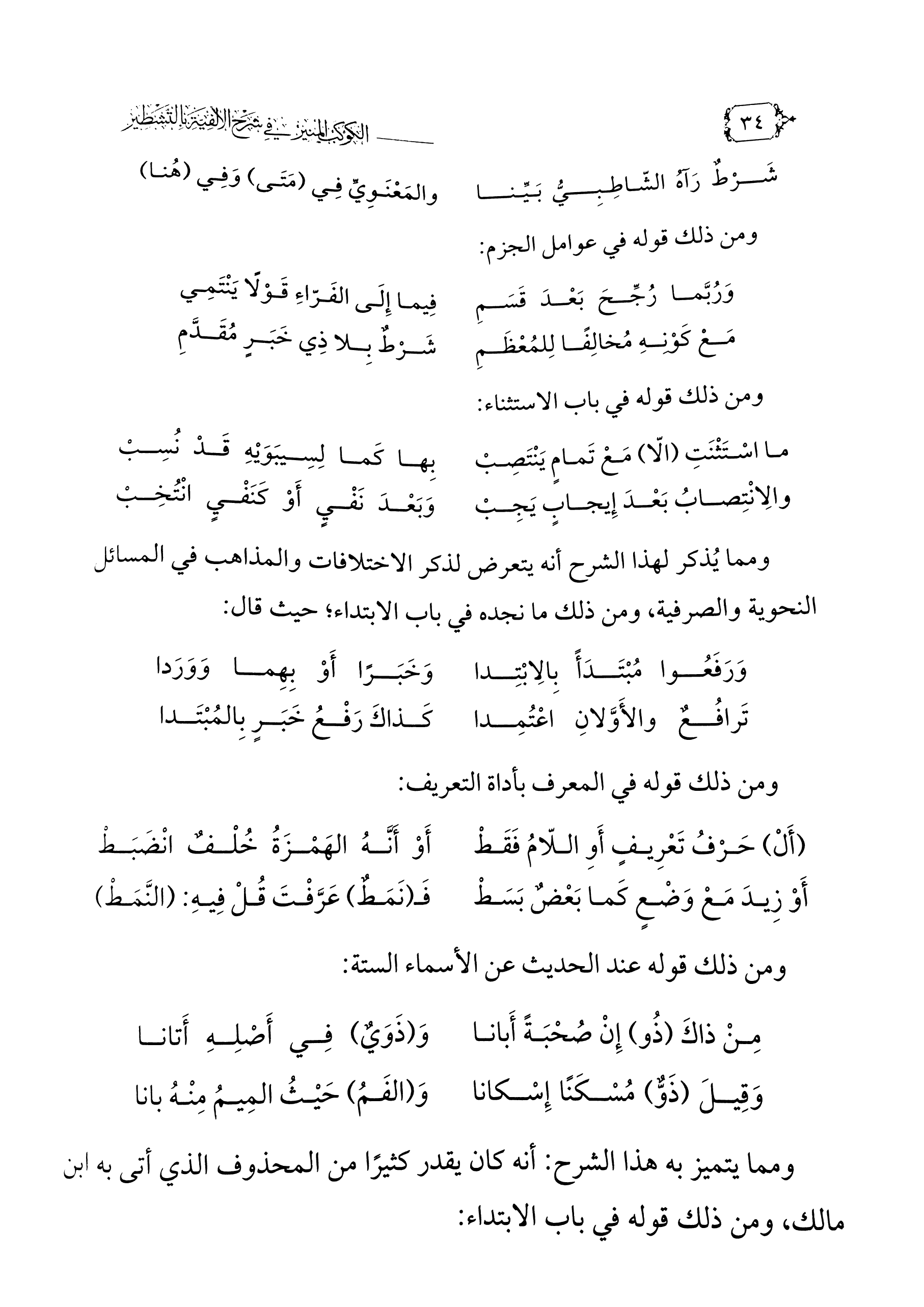 ومما يُذكر لهذا الشرح أنه يتعرض لذكر الاختلافات والمذاهب في المسائل النحوية والصرفية، ومن ذلك ما نجده في باب الابتداء حيث قال: