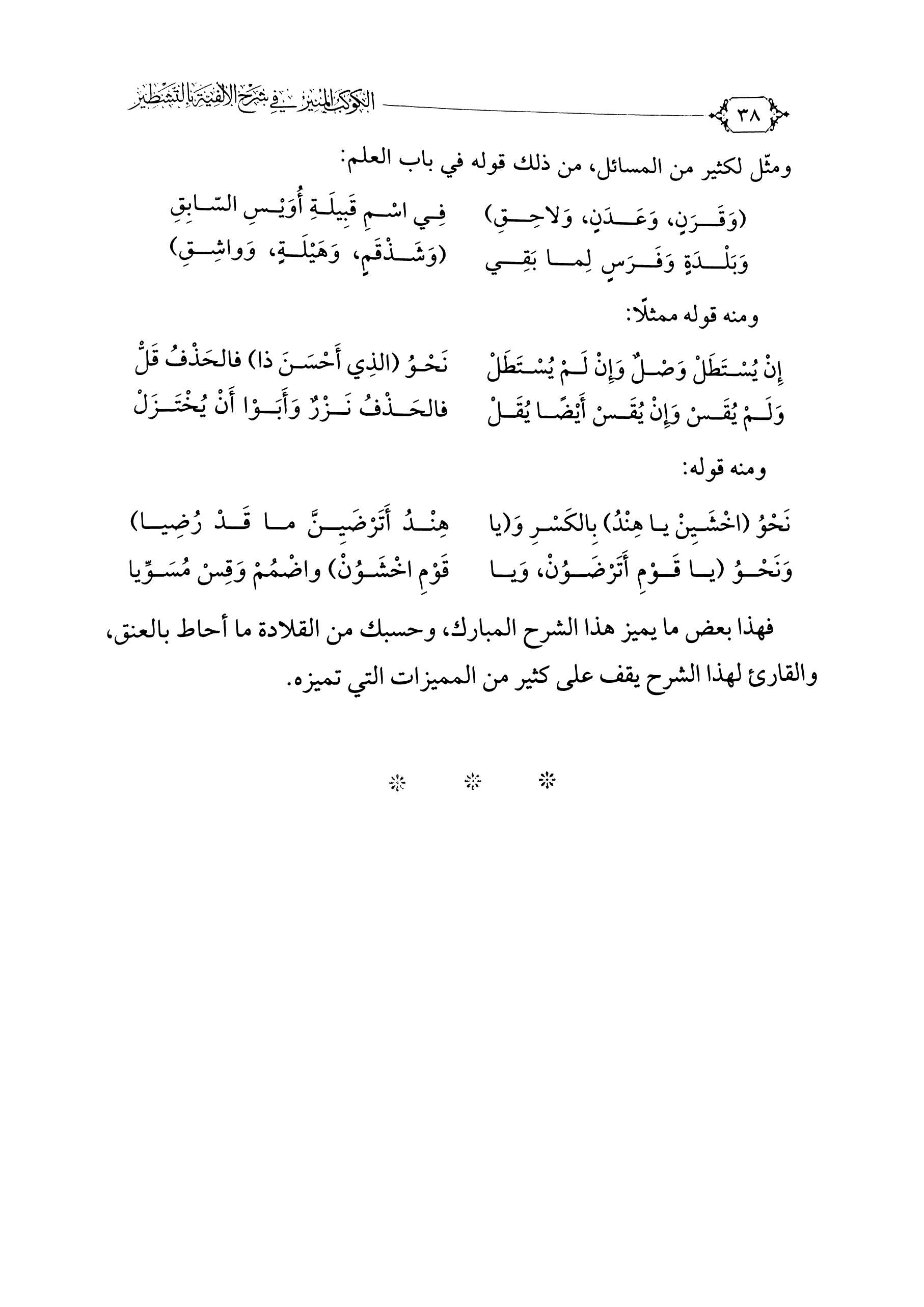 فهذا بعض ما يميز هذا الشرح المبارك، وحسبك من القلادة ما يحيط بالعنق، والقارئ لهذا الشرح يقف على كثير من المميزات التي تميز هذا الشرح.