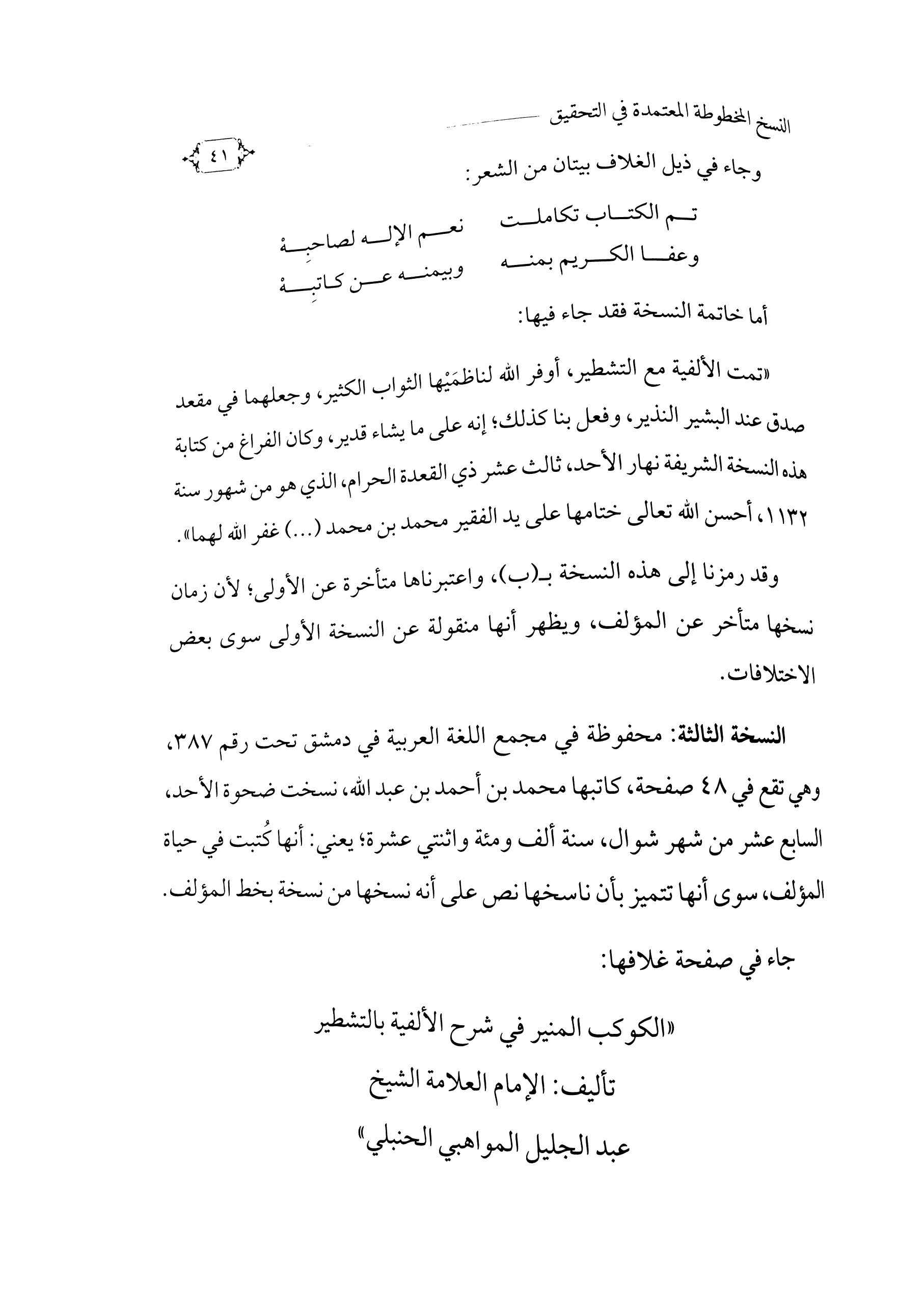 "تمت الألفية مع التشطير أوفر الله لناظميها الثواب الكثير وجعلهما في مقعد صدق عند البشير النذير وفعل بنا كذلك إنه على ما يشاء قدير وكان الفراغ من كتابة هذه النسخة الشريفة نهار الأحد ثالث عشر ذي القعدة الحرام الذي هو من شهور سنة ١١٣٢ أحسن الله تعالى ختامها على يد الفقير محمد بن محمد ( ... ) غفر الله لهما".