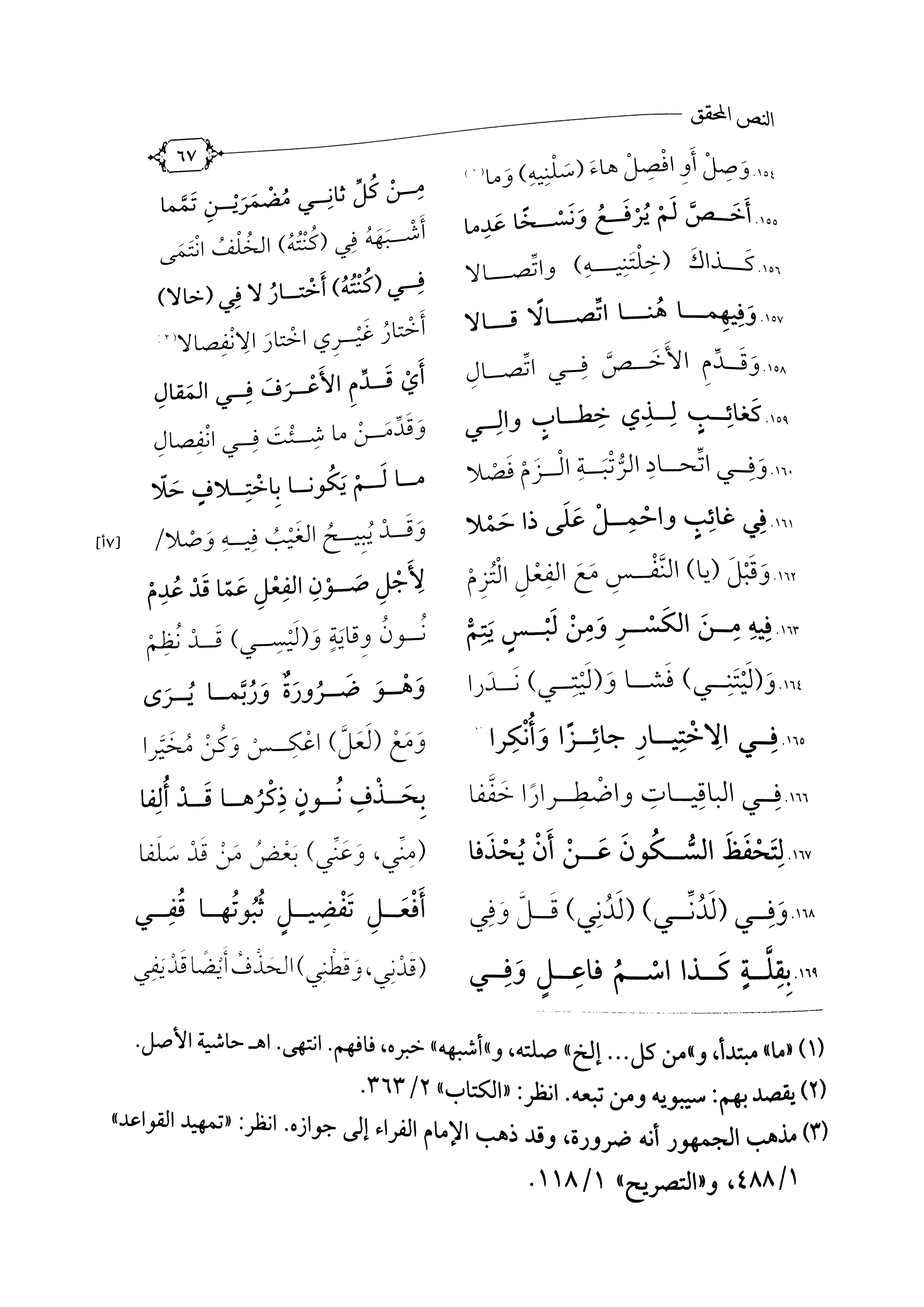 (¬٣) مذهب الجمهور أنه ضرورة، وقد ذهب الإمام الفراء إلى جوازه. انظر: تمهيد القواعد ١\ ٤٨٨ والتصريح ١\ ١١٨.