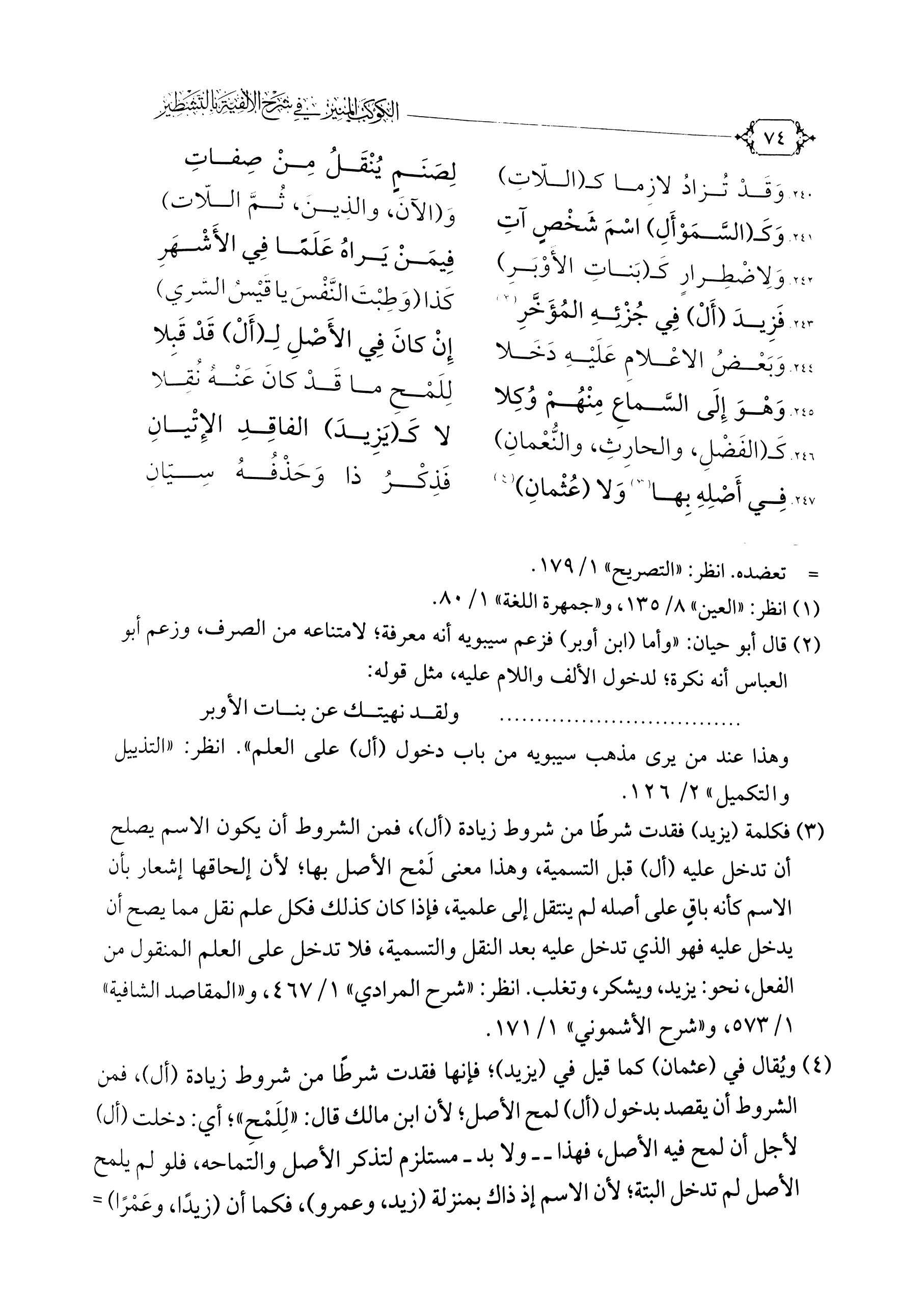 (¬٤) ويُقال في (عثمان) كما قيل في (يزيد)، فإنها فقدت شرطًا من شروط زيادة (أل)، فمن الشروط أن يقصد بدخول (أل) لمح الأصل، لأن ابن مالك قال: "لِلَمْحِ"، أي: دخلت (أل) لأجل أن لمح فيه الأصل، فهذا -ولا بد- مستلزم لتذكر الأصل والتماحه، فلو لم يلمح الأصل لم تدخل البتة؛ لأن الاسم إذ ذاك بمنزلة (زيد، وعمرو)، فكما أن (زيدًا، وعمرًا) لا تدخل عليه الألف واللام، فكذلك ما كان بمعناه، ولذلك تجد كثيرًا من الصفات المسمى بها لا تدخل عليها، كـ (مالك، وحاتم، ومتمم، وفاطمة، وعائشة)، وما أشبه ذلك. انظر: شرح المرادي ١\ ٤٦٧ والمقاصد الشافية ١\ ٥٧٣ وشرح الأشموني ١\ ١٧١.