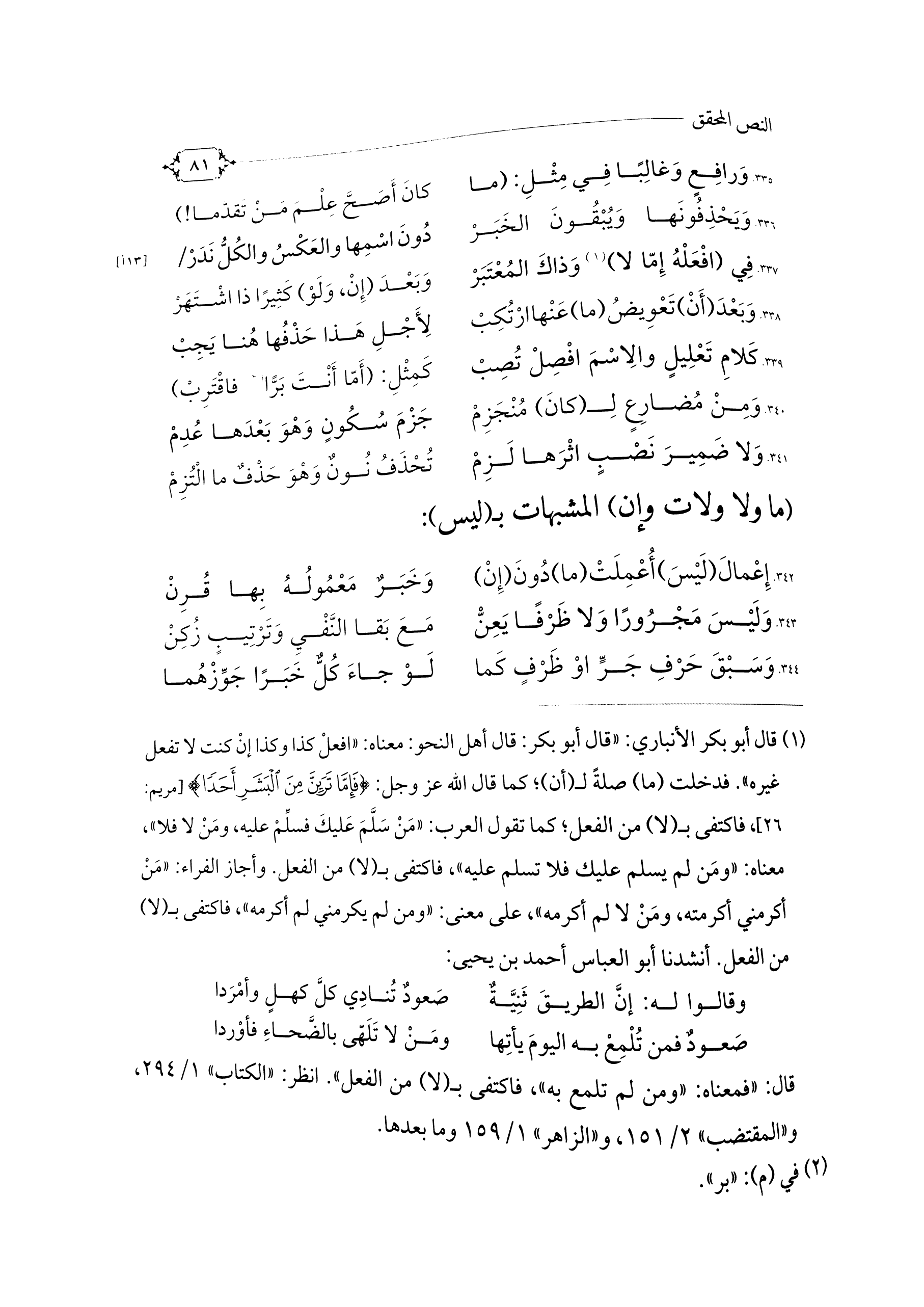 ٣٤٢. إِعْمَالَ (لَيْسَ) أُعْمِلَتْ (مَا) دُونَ (إِنْ) ... وَخَبَرٌ مَعْمُولُهُ بِهَا قُرِنْ ...