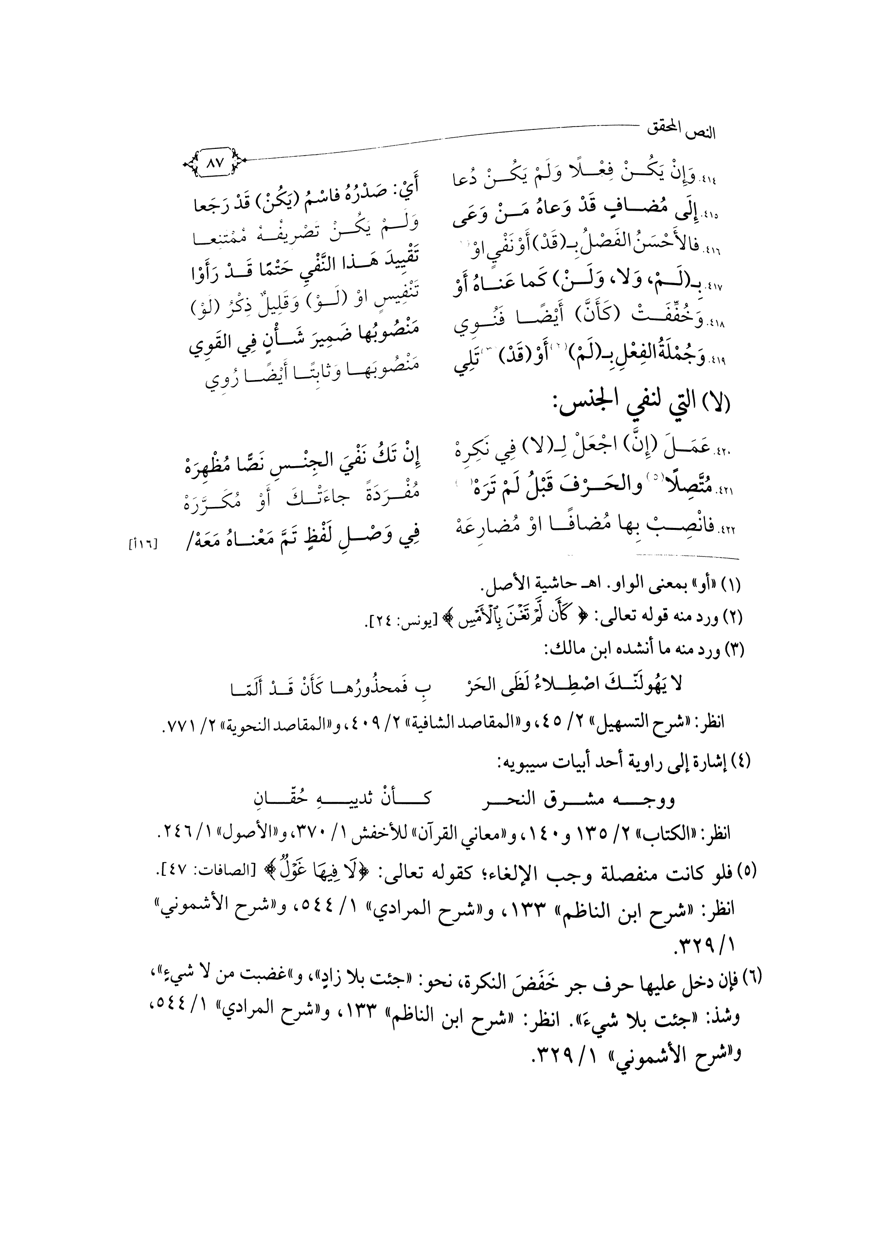 ٤٢٠. عَمَلَ (إِنَّ) اجْعَلْ لِـ (لَا) فِي نَكِرِهْ ... إِنْ تَكُ نَفْيَ الجِنْسِ نَصًّا مُظْهِرَهْ ...