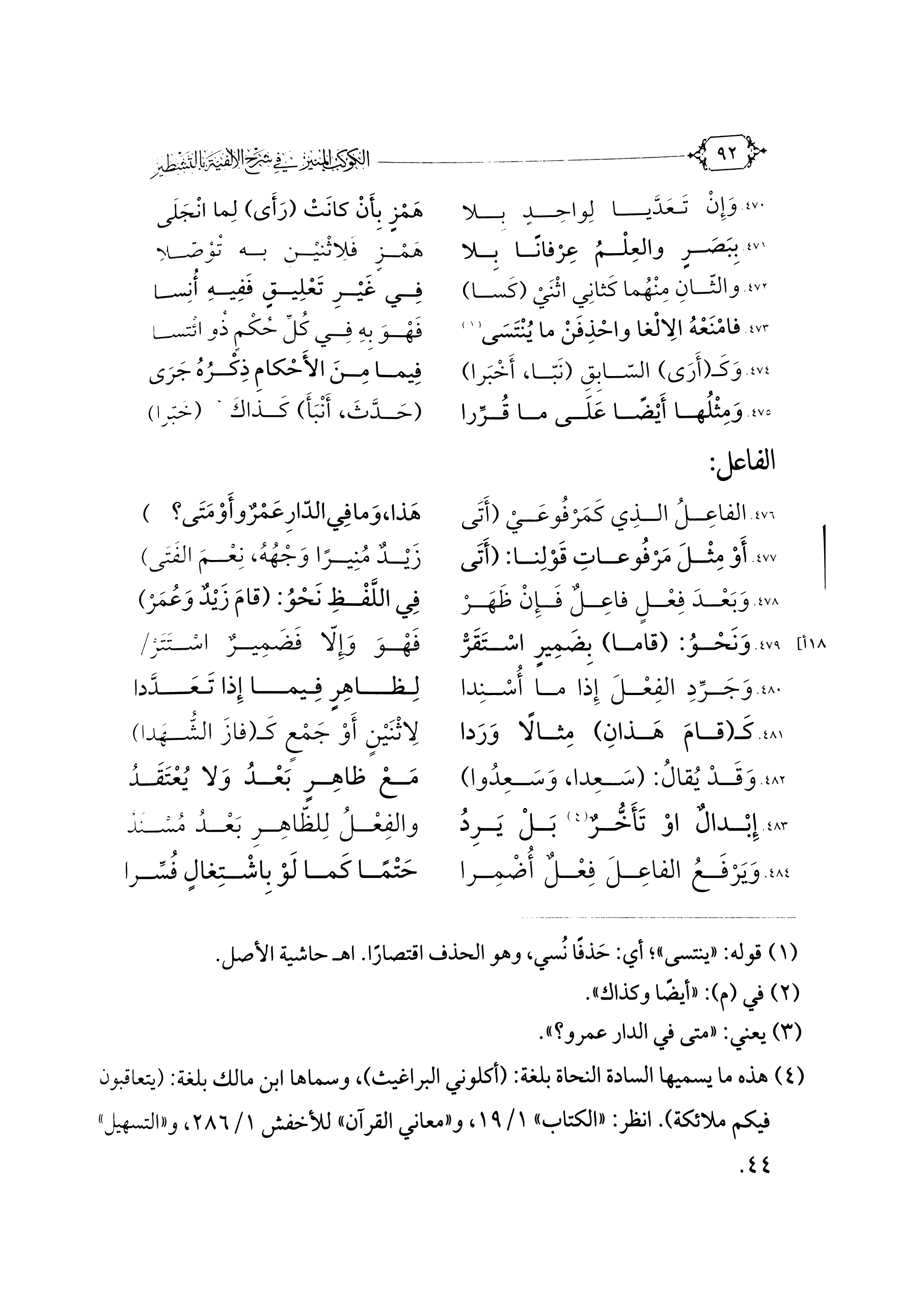 ٤٧٦. الفَاعِلُ الذِي كَمَرْفُوعَيْ (أَتَى ... هَذَا، وَمَا فِي الدَّارِ عَمْرٌو أَوْ مَتَى (¬٣)) ...