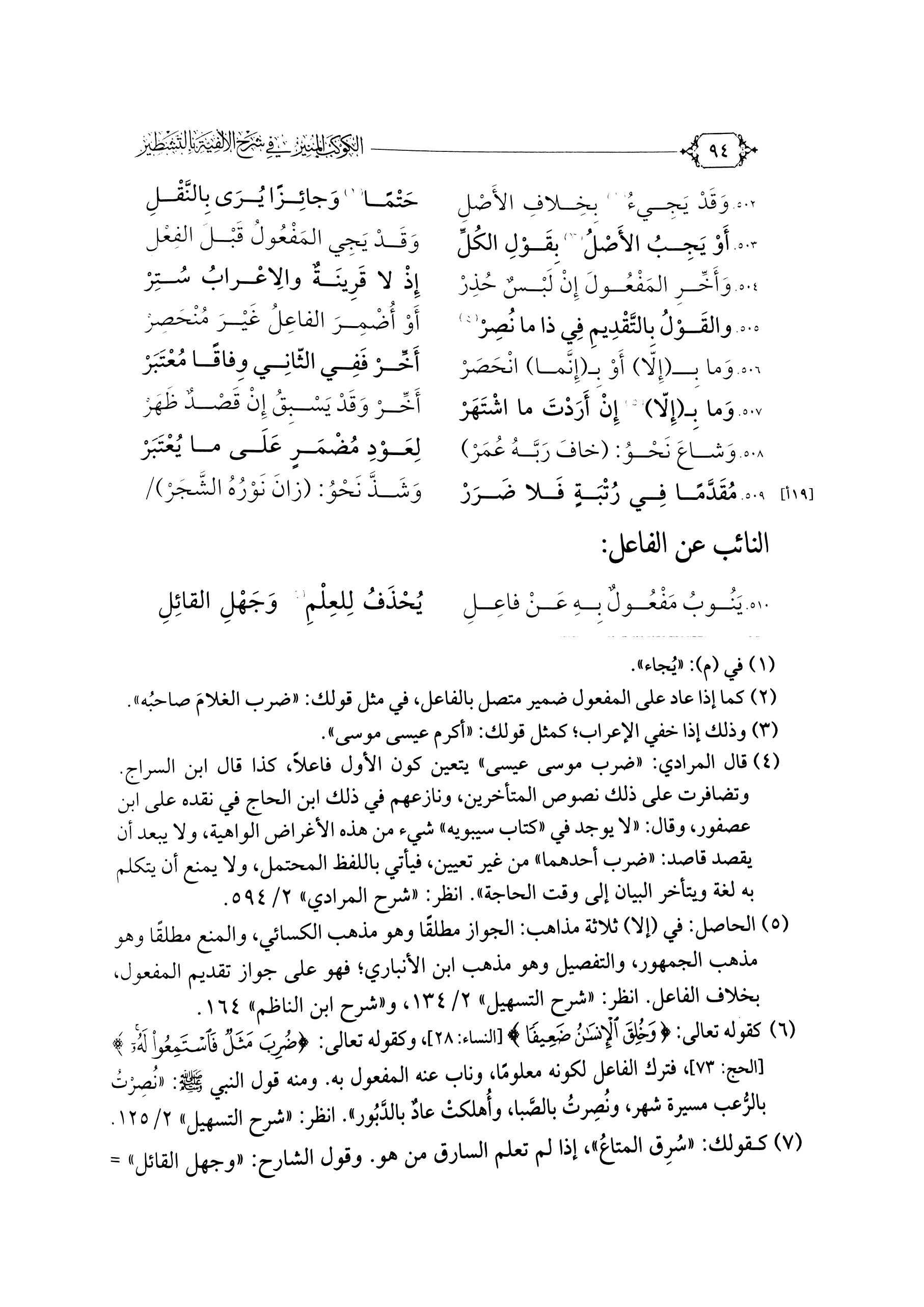 (¬٥) الحاصل في (إلا) ثلاثة مذاهب: الجواز مطلقًا وهو مذهب الكسائي، والمنع مطلقًا وهو مذهب الجمهور، والتفصيل وهو مذهب ابن الأنباري فهو على جواز تقديم المفعول بخلاف الفاعل. انظر: شرح التسهيل ٢\ ١٣٤ وشرح ابن الناظم ١٦٤.