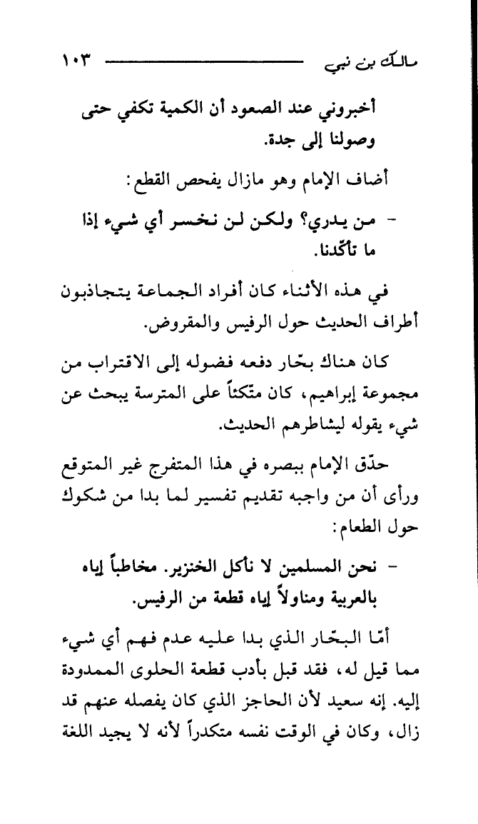 - نحن المسلمين لا نأكل الخنزير. مخاطبا إياه بالعربية ومناولا إياه قطعة من الرفيس.