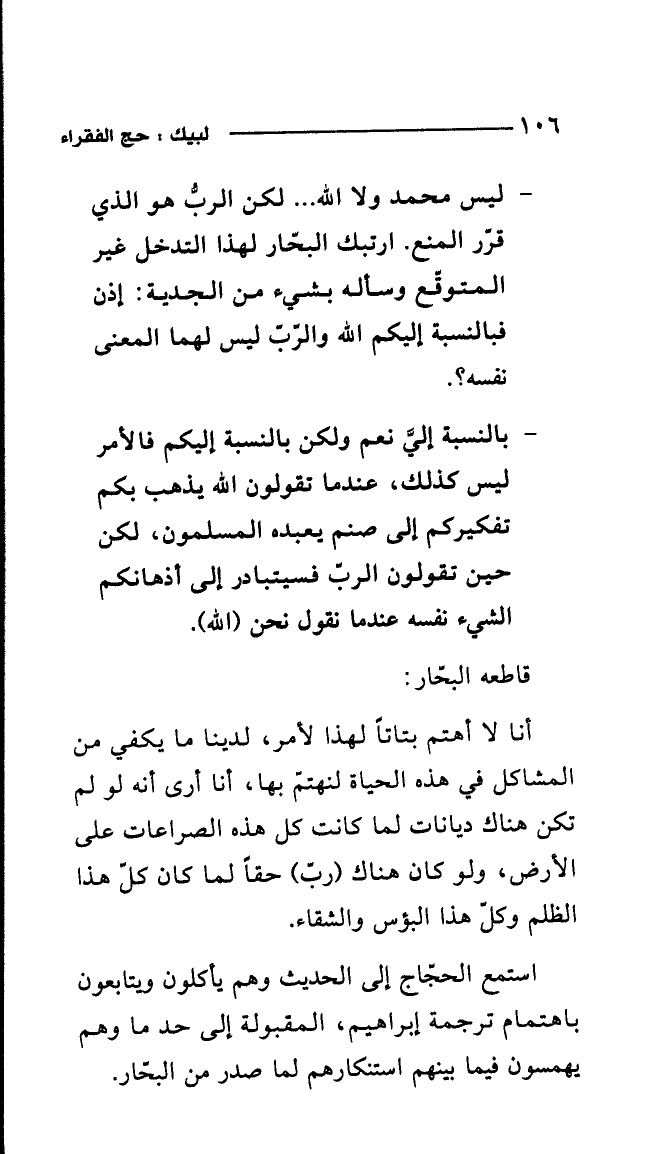 - ليس محمد ولا الله ... لكن الرب هو الذي قرر المنع. ارتبك البحار لهذا التدخل غير المتوقع وسأله بشيء من الجدية: إذن فبالنسبة إليكم الله والرب ليس لهما المعنى نفسه؟.