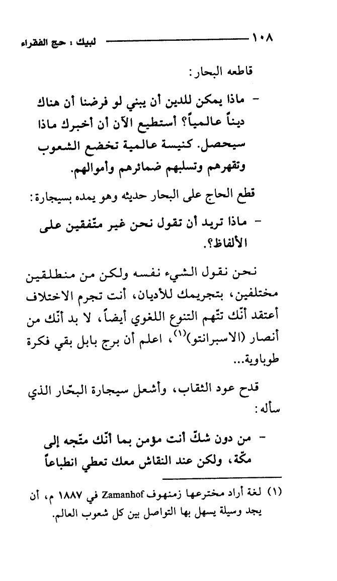 نحن نقول الشيء نفسه ولكن من منطلقين مختلفين، بتجريمك للأديان، أنت تجرم الاختلاف أعتقد أنك تتهم التنوع اللغوي أيضا، لا بد أنك من أنصار (الاسبرانتو) (¬1)، اعلم أن برج بابل بقي فكرة طوباوية ...