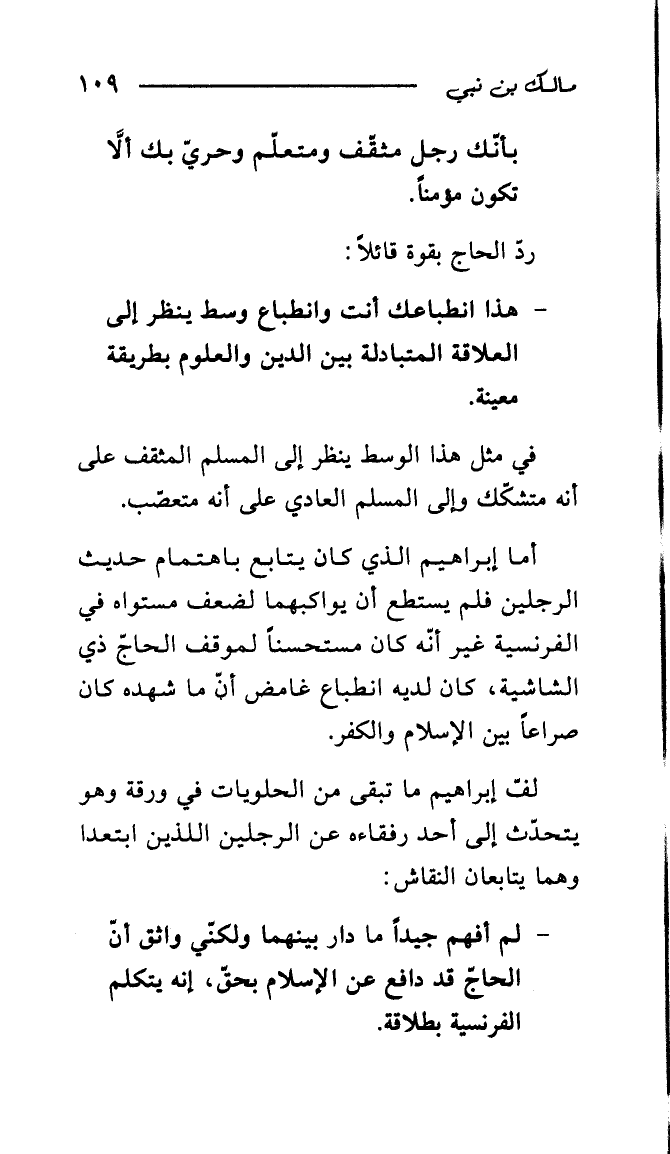 أما إبراهيم الذي كان يتابع باهتمام حديث الرجلين فلم يستطع أن يواكبهما لضعف مستواه في الفرنسية غير أنه كان مستحسنا لموقف الحاج ذي الشاشية، كان لديه انطباع غامض أن ما شهده كان صراعا بين الإسلام والكفر.