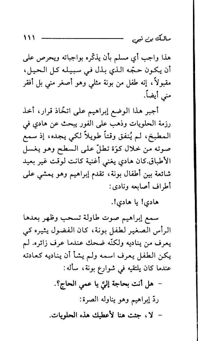 أجبر هذا الوضع إبراهيم على اتخاذ قرار، أخذ رزمة الحلويات وذهب على الفور يبحث عن هادي في المطبخ، لم ينفق وقتا طويلا لكي يجده، إذ سمع صوته من خلال كوة تطل على السطح وهو يغسل الأطباق. كان هادي يغني أغنية كانت لوقت غير بعيد شائعة بين أطفال بونة، تقدم إبراهيم وهو يمشي على أطراف أصابعه ونادى: