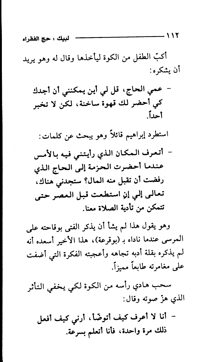 - عمي الحاج، قل لي أين يمكنني أن أجدك كي أحضر لك قهوة ساختة، لكن لا تخبر أحدا.