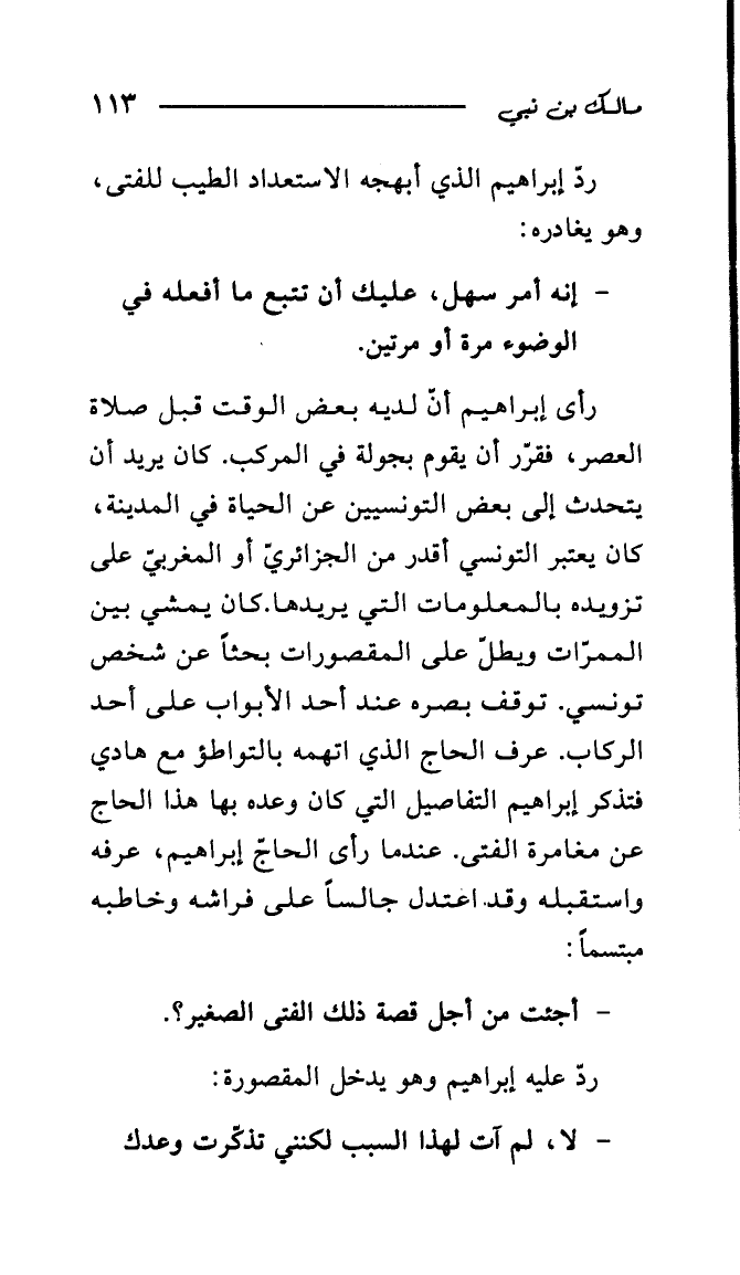 كان يعتبر التونسي أقدر من الجزائري أو المغربي على تزويده بالمعلومات التي يريدها. كان يمشي بين الممرات ويطل على المقصورات بحثا عن شخص تونسي. توقف بصرة عند أحد الأبواب على أحد الركاب. عرف الحاج الذي اتهمه بالتواطؤ مع هادي فتذكر إبراهيم التفاصيل التي كان وعده بها هذا الحاج عن مغامرة الفتى. عندما رأى الحاج إبراهيم، عرفه واستقبله وقد اعتدل جالسا على فراشه وخاطبه مبتسما: