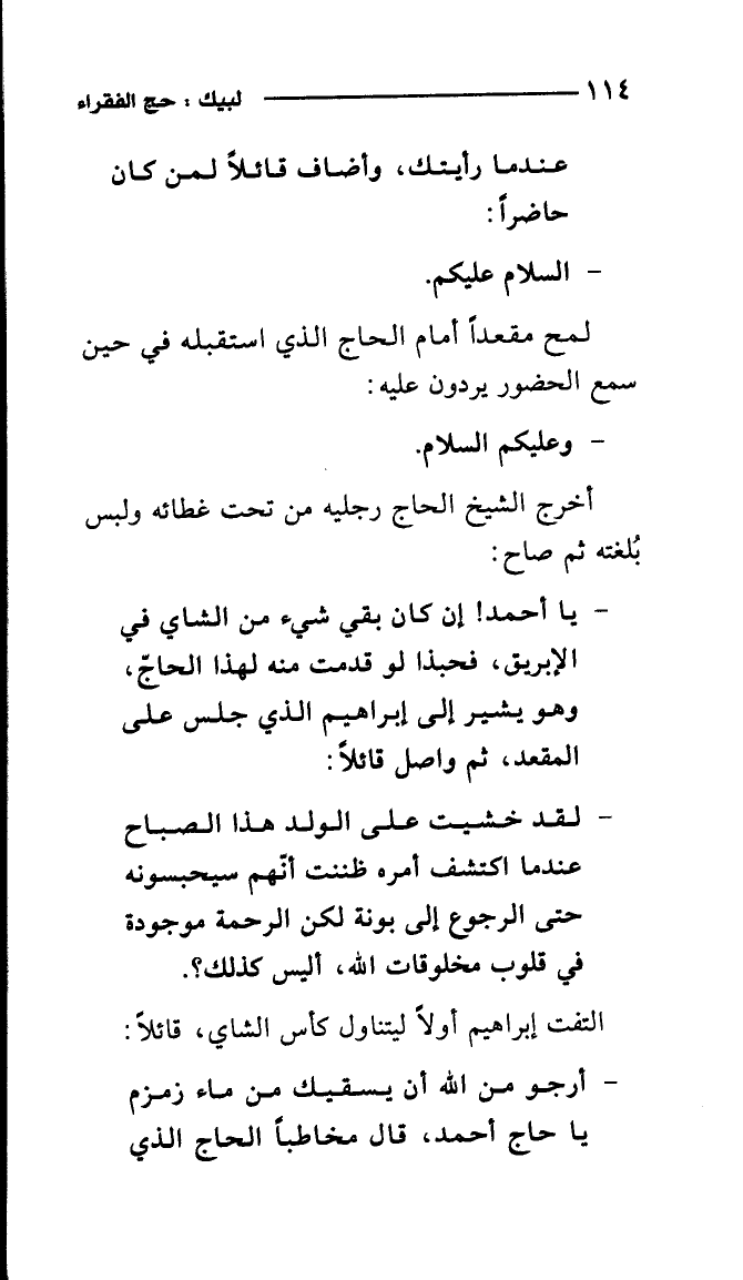 التفت إبراهيم أولا ليتناول كأس الشاي، قائلا: - أرجو من الله أن يسقبك من ماء زمزم يا حاج أحمد، قال مخاطبا الحاج الذي