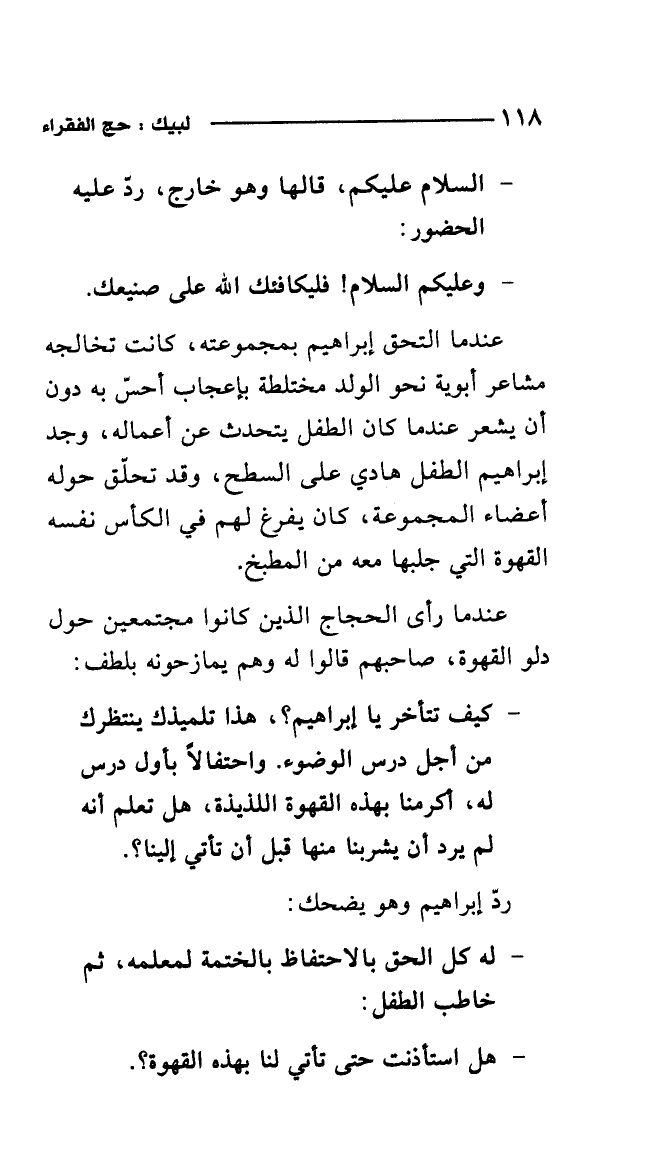 - وعليكم السلام؟ فليكافئك الله على صنيعك. عندما التحق إبراهيم بمجموعته، كانت تخالجه مشاعر أبوية نحو الولد مختلطة بإعجاب أحس به دون أن يشعر عندما كان الطفل يتحدث عن أعماله، وجد إبراهيم الطفل هادي على السطح، وقد تحلق حوله أعضاء المجموعة، كان يفرغ لهم في الكأس نفسه القهوة التي جلبها معه من المطبخ.