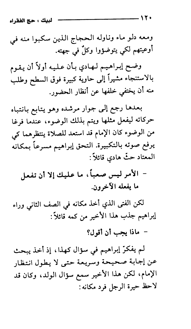 بعدها رجع إلى جوار مرشده وهو يتابع بانتباه حركاته ليفعل مثلها ويتم بذلك الوضوء، عندما فرغا من الوضوء كان الإمام قد استعد للصلاة ينتظرهما كي يرفع صوته بالتكبير .. التحق إبراهيم مسرعا بمكانه المعتاد حث هادي قائلا:
