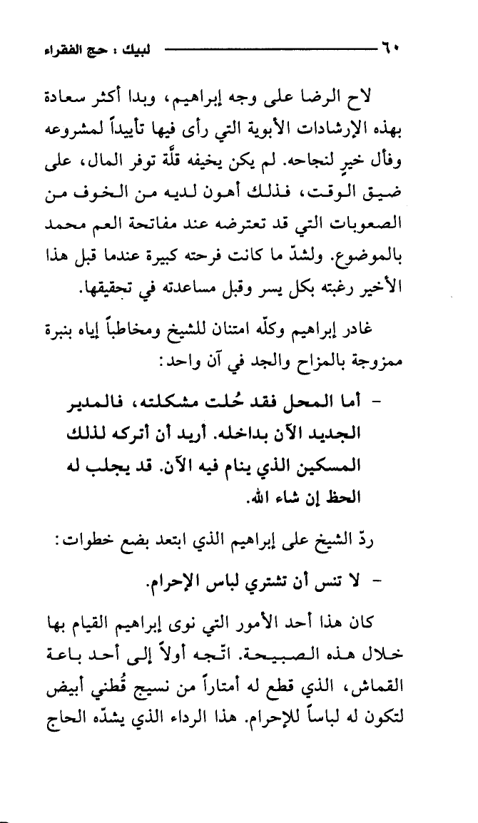 كان هذا أحد الأمور التي نوى إبراهيم القيام بها خلال هذه الصبيحة. اتجه أولا إلى أحد باعة القماش، الذي قطع له أمتارا من نسيج قطني أبيض لتكون له لباسا للإحرام. هذا الرداء الذي يشده الحاج