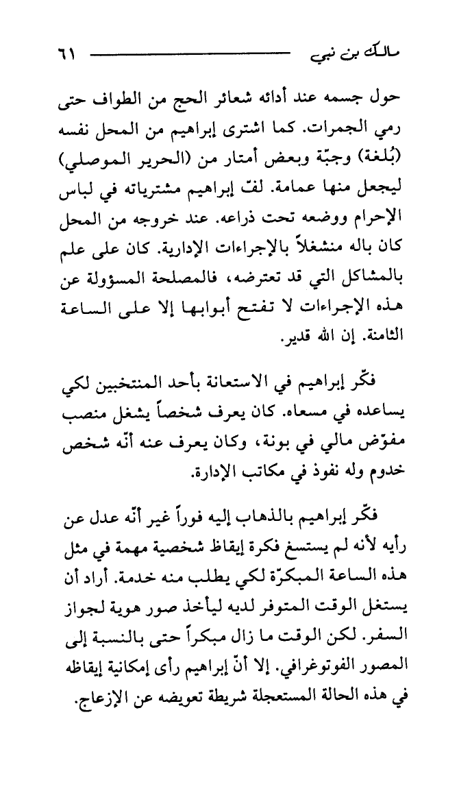 حول جسمه عند أدائه شعائر الحج من الطواف حتى رمي الجمرات. كما اشترى إبراهيم من المحل نفسه (بلغة) وجبة وبعض أمتار من (الحرير الموصلي) ليجعل منها عمامة. لف إبراهيم مشترياته في لباس الإحرام ووضعه تحت ذراعه. عند خروجه من المحل كان باله منشغلا بالإجراءات الإدارية. كان على علم بالمشاكل التي قد تعترضه، فالمصلحة المسؤولة عن هذه الإجراءات لا تفتح أبوابها إلا على الساعة الثامنة. إن الله قدير.