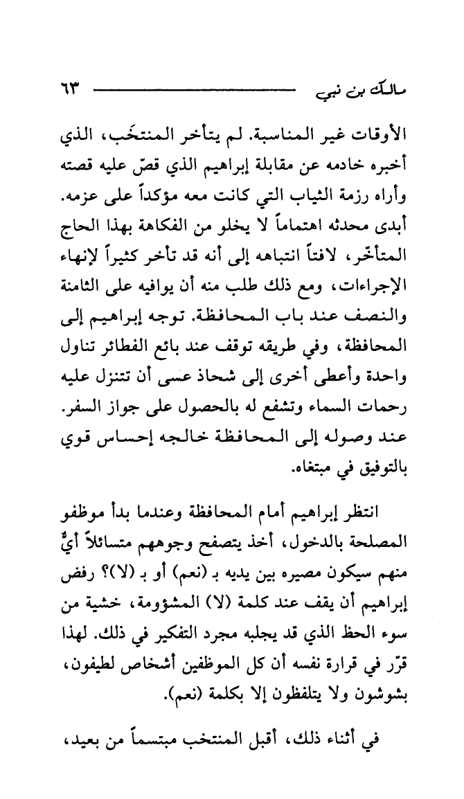 الأوقات غير المناسبة. لم يتأخر المنتخب، الذي أخبره خادمه عن مقابلة إبراهيم الذي قص عليه قصته وأراه رزمة الثياب التي كانت معه مؤكدا على عزمه. أبدى محدثه اهتماما لا يخلو من الفكاهة بهذا الحاج المتأخر، لافتا انتباهه إلى أنه قد تأخر كثيرا لإنهاء الإجراءات، ومع ذلك طلب منه أن يوافيه على الثامنة والنصف عند باب المحافظة. توجه إبراهيم إلى المحافظة، وفي طريقه توقف عند بائع الفطائر تناول واحدة وأعطى أخرى إلى شحاذ عسى أن تتنزل عليه رحمات السماء وتشفع له بالحصول على جواز السفر. عند وصوله إلى المحافظة خالجه إحساس قوي بالتوفيق في مبتغاه.