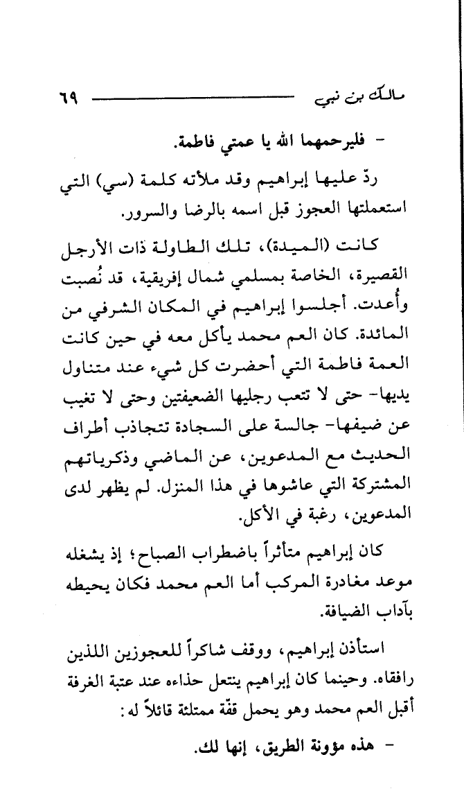 كانت (الميدة)، تلك الطاولة ذات الأرجل القصيرة، الخاصة بمسلمي شمال إفريقية، قد نصبت وأعدت. أجلسوا إبراهيم في المكان الشرفي من المائدة. كان العم محمد يأكل معه في حين كانت العمة فاطمة التي أحضرت كل شيء عند متناول يديها - حتى لا تتعب رجليها الضعيفتين وحتى لا تغيب عن ضيفها - جالسة على السجادة تتجاذب أطراف الحديث مع المدعوين، عن الماضي وذكرياتهم المشتركة التي عاشوها في هذا المنزل. لم يظهر لدى