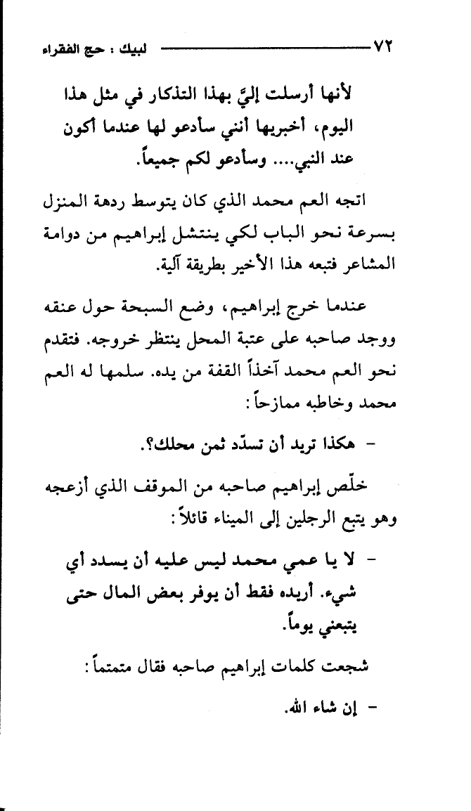 عندما خرج إبراهيم، وضع السبحة حول عنقه ووجد صاحبه على عتبة المحل ينتظر خروجه. فتقدم نحو العم محمد آخذا القفة من يده. سلمها له العم محمد وخاطبه ممازحا: