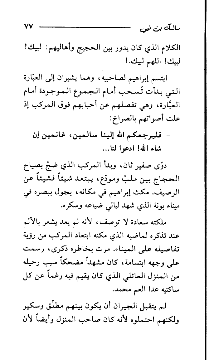 دوى صفير ثان، وبدأ المركب الذي ضج بصياح الحجاج بين ملب ومودع، يبتعد شيئا فشيئا عن الرصيف. مكث إبراهيم في مكانه، يجول ببصره في ميناء بونة الذي شهد ليالي ضياعه وسكره.