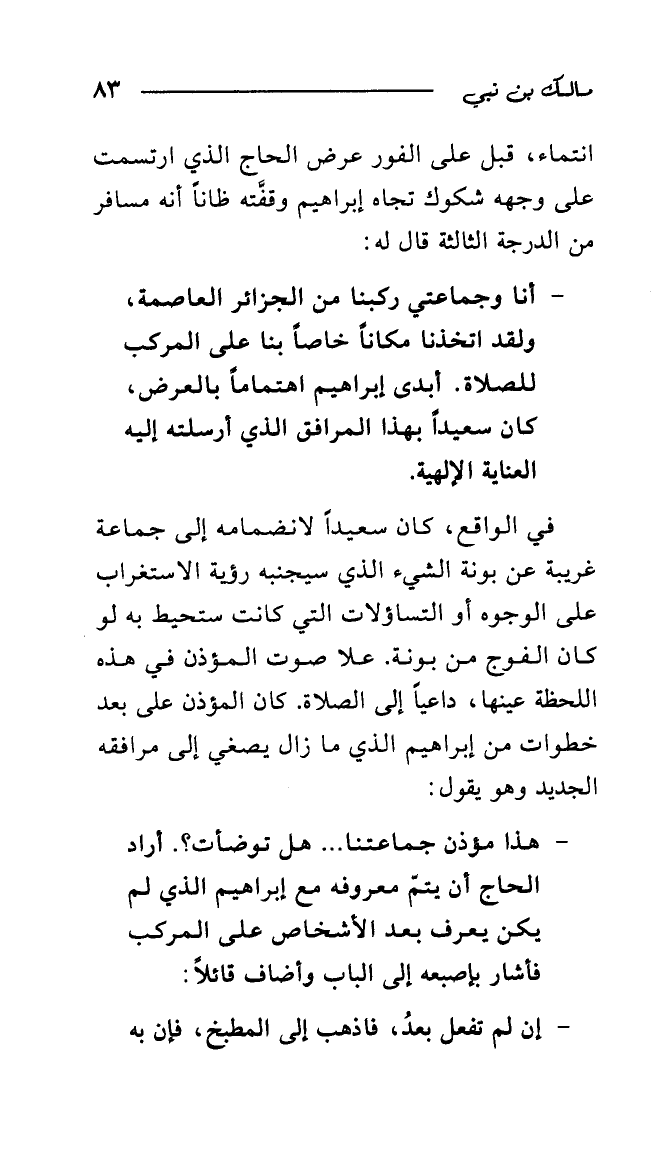 - أنا وجماعتي ركبنا من الجزائر العاصمة، ولقد اتخذنا مكانا خاصا بنا على المركب للصلاة. أبدى إبراهيم اهتماما بالعرض، كان سعيدا بهذا المرافق الذي أرسلته إليه العناية الإلهية.