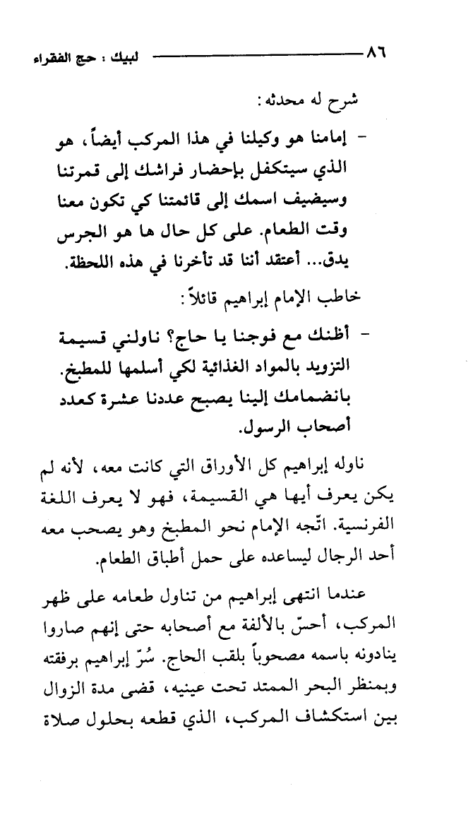عندما انتهى إبراهيم من تناول طعامه على ظهر المركب، أحس بالألفة مع أصحابه حتى إنهم صاروا ينادونه باسمه مصحوبا بلقب الحاج. سر إبراهيم برفقته وبمنظر البحر الممتد تحت عينيه، قضى مدة الزوال بين استكشاف المركب، الذي قطعه بحلول صلاة