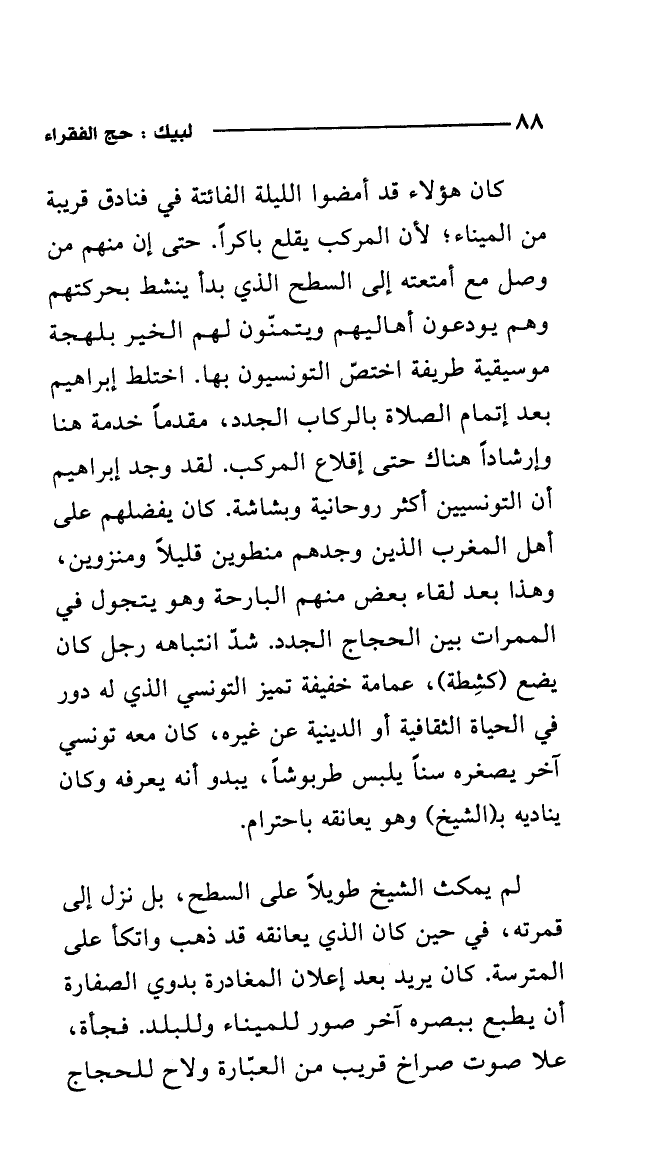 كان هؤلاء قد أمضوا الليلة الفائتة في فنادق قريبة من الميناء؛ لأن المركب يقلع باكرا. حتى إن منهم من وصل مع أمتعته إلى السطح الذي بدأ ينشط بحركتهم وهم يودعون أهاليهم ويتمنون لهم الخير بلهجة موسيقية طريفة اختص التونسيون بها. اختلط إبراهيم بعد إتمام الصلاة بالركاب الجدد، مقدما خدمة هنا وإرشادا هناك حتى إقلاع المركب. لقد وجد إبراهيم أن التونسيين أكثر روحانية وبشاشة. كان يفضلهم على أهل المغرب الذين وجدهم منطوين قليلا ومنزوين، وهذا بعد لقاء بعض منهم البارحة وهو يتجول في الممرات بين الحجاج الجدد. شد انتباهه رجل كان يضع (كشطة)، عمامة خفيفة تميز التونسي الذي له دور في الحياة الثفافية أو الدينية عن غيره، كان معه تونسي آخر يصغره سنا يلبس طربوشا، يبدو أنه يعرفه وكان يناديه بـ (الشيخ) وهو يعانقه باحترام.