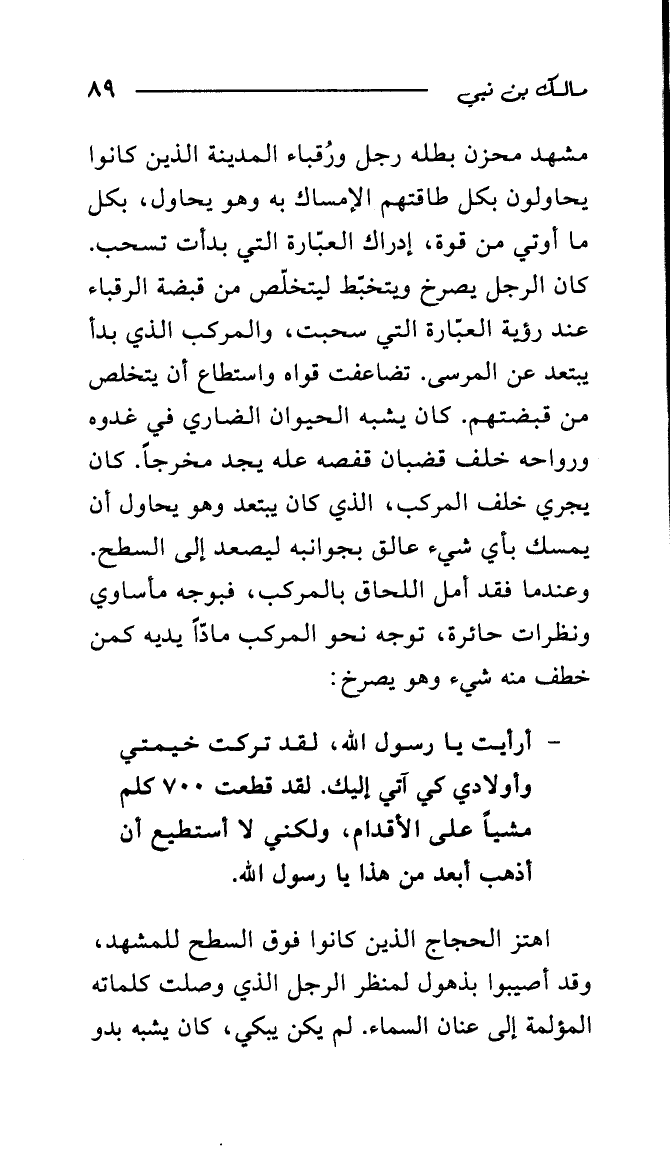 مشهد محزن بطله رجل ورقباء المدينة الذين كانوا يحاولون بكل طاقتهم الإمساك به وهو يحاول، بكل ما أوتي من قوة، إدراك العبارة التي بدأت تسحب. كان الرجل يصرخ ويتخبط ليتخلص من قبضة الرقباء عند رؤية العبارة التي سحبت، والمركب الذي بدأ يبتعد عن المرسى. تضاعفت قواه واستطاع أن يتخلص من قبضتهم. كان يشبه الحيوان الضاري في غدوه ورواحه خلف قضبان قفصه عله يجد مخرجا. كان يجري خلف المركب، الذي كان يبتعد وهو يحاول أن يمسك بأي شيء عالق بجوانبه ليصعد إلى السطح. وعندما فقد أمل اللحاق بالمركب، فبوجه مأساوي ونظرات حائرة، توجه نحو المركب مادا يديه كمن خطف منه شيء وهو يصرخ: - أرأيت يا رسول الله، لقد تركت خيمتي وأولادي كي آتي إليك. لقد قطعت 700 كلم مشيا على الأقدام، ولكني لا أستطيع أن أذهب أبعد من هذا يا رسول الله.