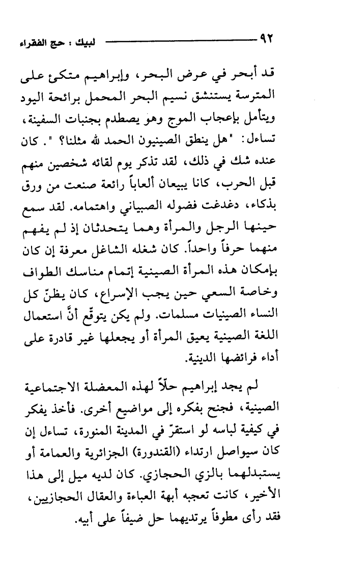 قد أبحر في عرض البحر، وإبراهيم متكئ على المترسة يستنثق نسيم البحر المحمل برائحة اليود ويتأمل بإعجاب الموج وهو يصطدم بجنبات السفينة، تساءل: (هل ينطق الصينيون الحمد لله مثلنا؟). كان عنده شك في ذلك، لقد تذكر يوم لقائه شخصين منهم قبل الحرب، كانا يبيعان ألعابا رائعة صنعت من ورق بذكاء، دغدغت فضوله الصبياني واهتمامه. لقد سمع حينها الرجل والمرأة وهما يتحدثان إذ لم يفهم منهما حرفا واحدا. كان شغله الشاغل معرفة إن كان بإمكان هذه المرأة الصينية إتمام مناسك الطواف وخاصة السعي حين يجب الإسرع، كان يظن كل النساء الصينيات مسلمات. ولم يكن يتوقع أن استعمال اللغة الصينية يعيق المرأة أو يجعلها غير قادرة على أداء فرائضها الدينية.