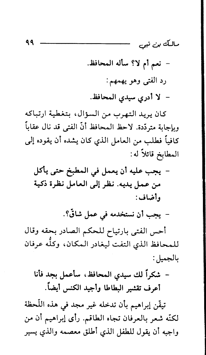 كان يريد التهرب من السؤال، بتغطية ارتباكه وبإجابة مترددة. لاحظ المحافظ أن الفتى قد نال عقابا كافيا فطلب من العامل الذي كان يشده أن يقوده إلى المطابخ قائلا له: