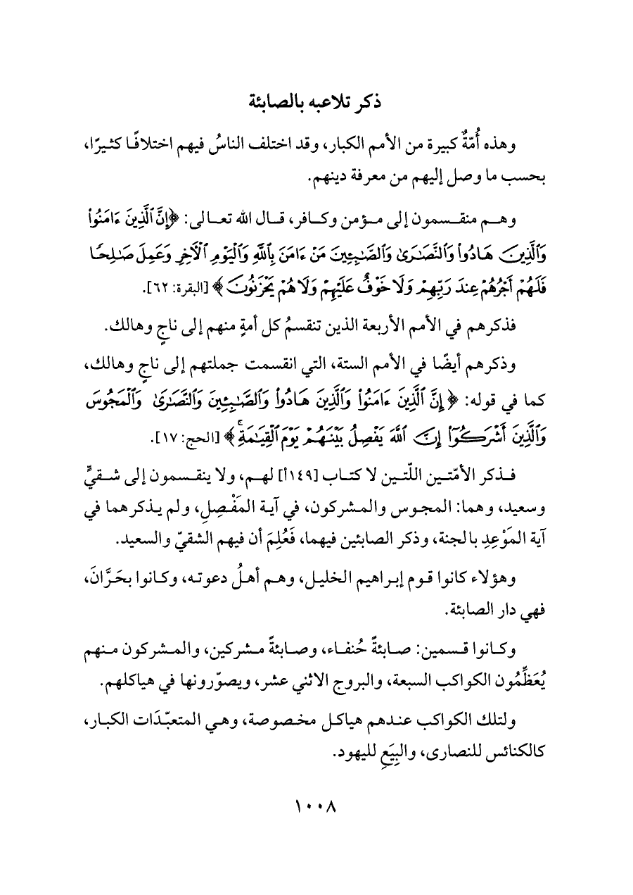 وذكرهم أيضًا في الأمم الستة، التي انقسمت جملتهم إلى ناجٍ وهالك، كما في قوله: {إِنَّ الَّذِينَ آمَنُوا وَالَّذِينَ هَادُوا وَالصَّابِئِينَ وَالنَّصَارَى وَالْمَجُوسَ وَالَّذِينَ أَشْرَكُوا إِنَّ اللَّهَ يَفْصِلُ بَيْنَهُمْ يَوْمَ الْقِيَامَةِ} [الحج: ١٧].