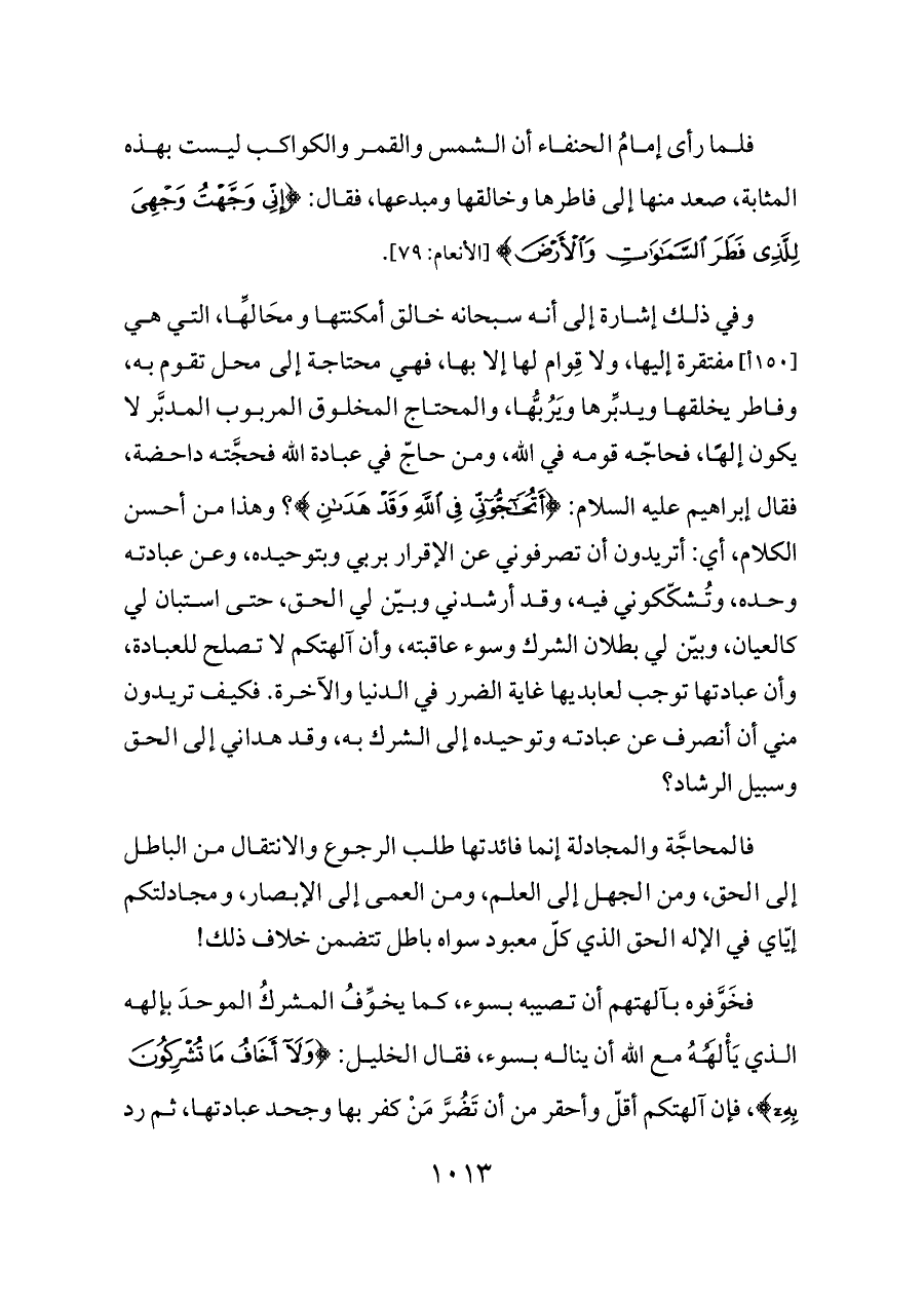 وفي ذلك إشارة إلى أنه سبحانه خالق أمكنتها ومَحالِّها، التي هي [١٥٠ أ] مفتقرة إليها، ولا قِوام لها إلا بها، فهي محتاجة إلى محل تقوم به، وفاطر يخلقها ويدبِّرها ويَرُبُّها، والمحتاج المخلوق المربوب المدبَّر لا يكون إلهًا، فحاجّه قومه في الله، ومن حاجّ في عبادة الله فحجَّته داحضة، فقال إبراهيم عليه السلام: {أَتُحَاجُّونِّي فِي اللَّهِ وَقَدْ هَدَانِ}؟ وهذا من أحسن الكلام، أي: أتريدون أن تصرفوني عن الإقرار بربي وبتوحيده، وعن عبادته وحده، وتُشكّكوني فيه، وقد أرشدني وبيّن لي الحق، حتى استبان لي كالعيان، وبيّن لي بطلان الشرك وسوء عاقبته، وأن آلهتكم لا تصلح للعبادة، وأن عبادتها توجب لعابديها غاية الضرر في الدنيا والآخرة. فكيف تريدون مني أن أنصرف عن عبادته وتوحيده إلى الشرك به، وقد هداني إلى الحق وسبيل الرشاد؟