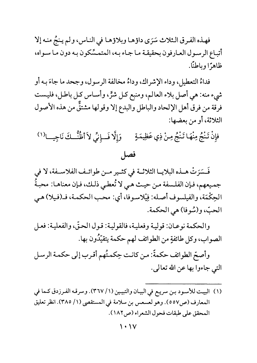 فَسَرَتْ هذه البلايا الثلاثة في كثير من طوائف الفلاسفة، لا في جميعهم، فإن الفلسفة من حيث هي لا تُعطي ذلك، فإن معناها: محبةُ الحِكْمَة، والفيلسوف أصله: فِيْلاسوفا، أي: محب الحكمة، فـ (فيلا) هي الحبّ، و (سُوفا) هي الحكمة.