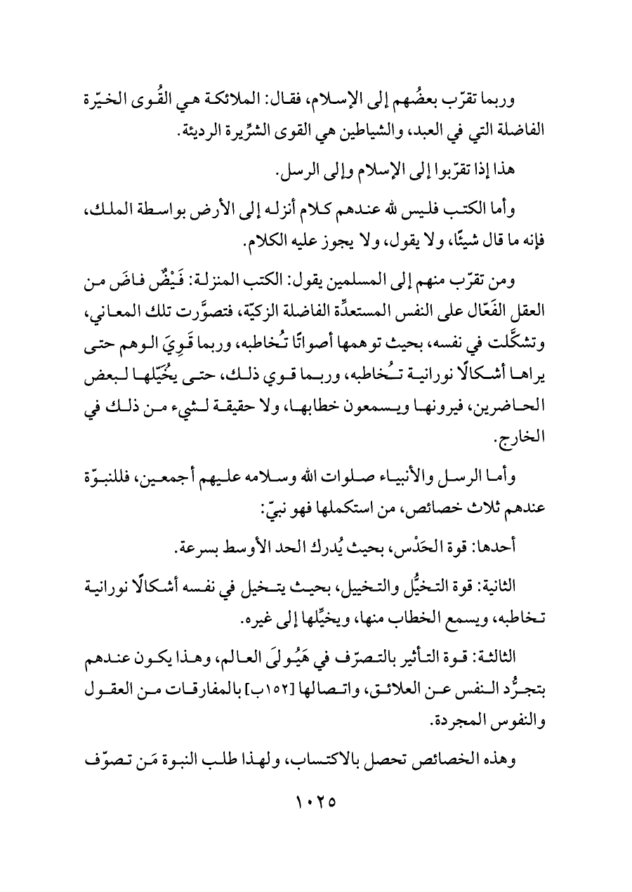 ومن تقرّب منهم إلى المسلمين يقول: الكتب المنزلة: فَيْضٌ فاضَ من العقل الفَعّال على النفس المستعدِّة الفاضلة الزكيّة، فتصوَّرت تلك المعاني، وتشكَّلت في نفسه، بحيث توهمها أصواتًا تُخاطبه، وربما قَوِيَ الوهم حتى يراها أشكالًا نورانية تُخاطبه، وربما قوي ذلك، حتى يُخَيّلها لبعض الحاضرين، فيرونها ويسمعون خطابها، ولا حقيقة لشيء من ذلك في الخارج.