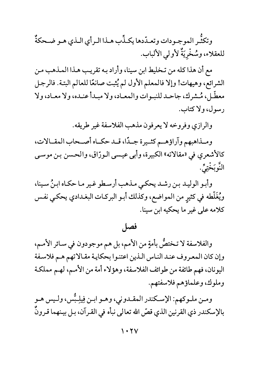مع أن هذا كله من تخليط ابن سينا، وأراد به تقريب هذا المذهب من الشرائع، وهيهات! وإلا فالمعلم الأول لم يُثبت صانعًا للعالم البتة. فالرجل معطّل، مُشرك، جاحد للنبوات والمعاد، ولا مبدأ عنده، ولا معاد، ولا رسول، ولا كتاب.