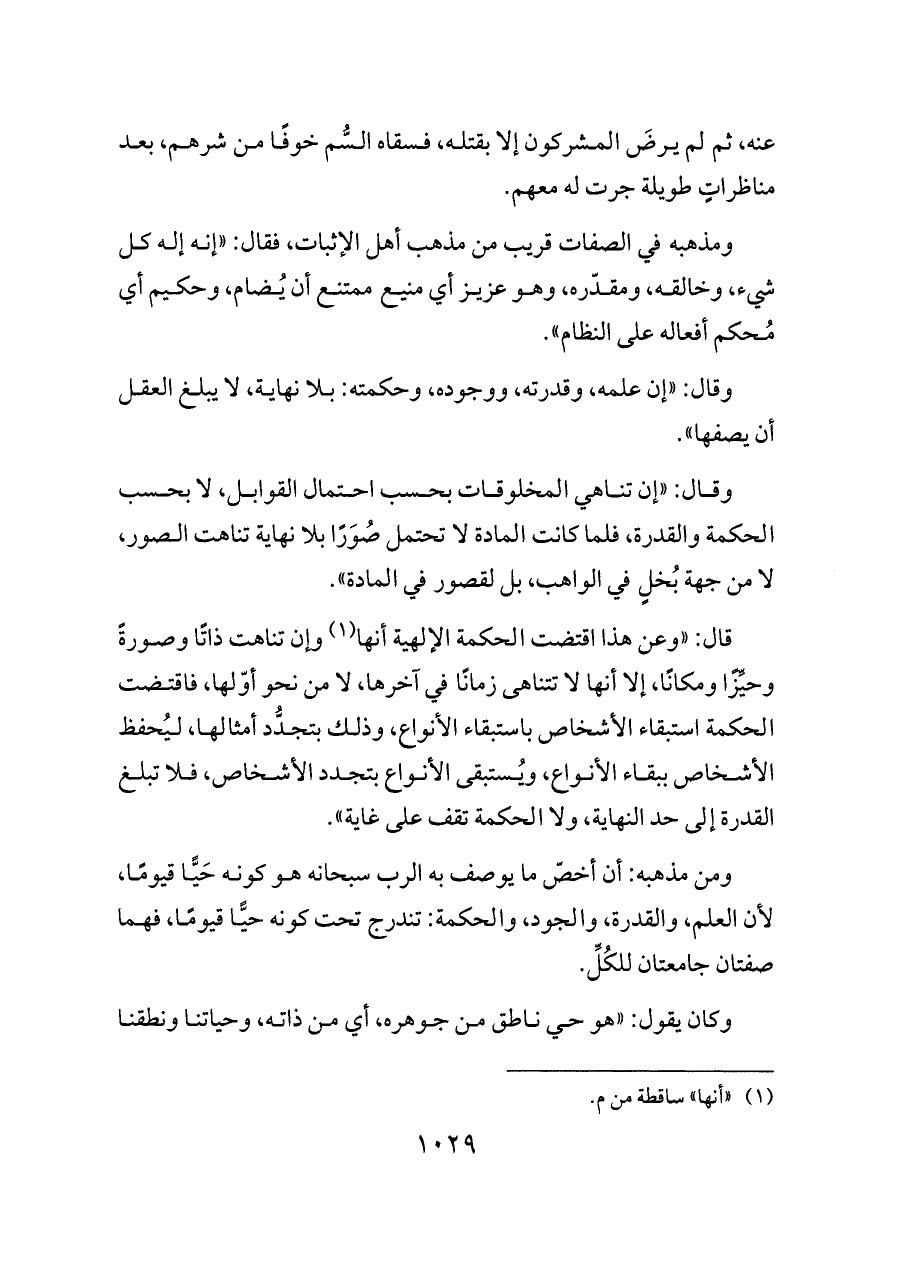 قال: «وعن هذا اقتضت الحكمة الإلهية أنها (¬١) وإن تناهت ذاتًا وصورةً وحيِّزًا ومكانًا، إلا أنها لا تتناهى زمانًا في آخرها، لا من نحو أوّلها، فاقتضت الحكمة استبقاء الأشخاص باستبقاء الأنواع، وذلك بتجدُّد أمثالها، ليُحفظ الأشخاص ببقاء الأنواع، ويُستبقى الأنواع بتجدد الأشخاص، فلا تبلغ القدرة إلى حد النهاية، ولا الحكمة تقف على غاية».