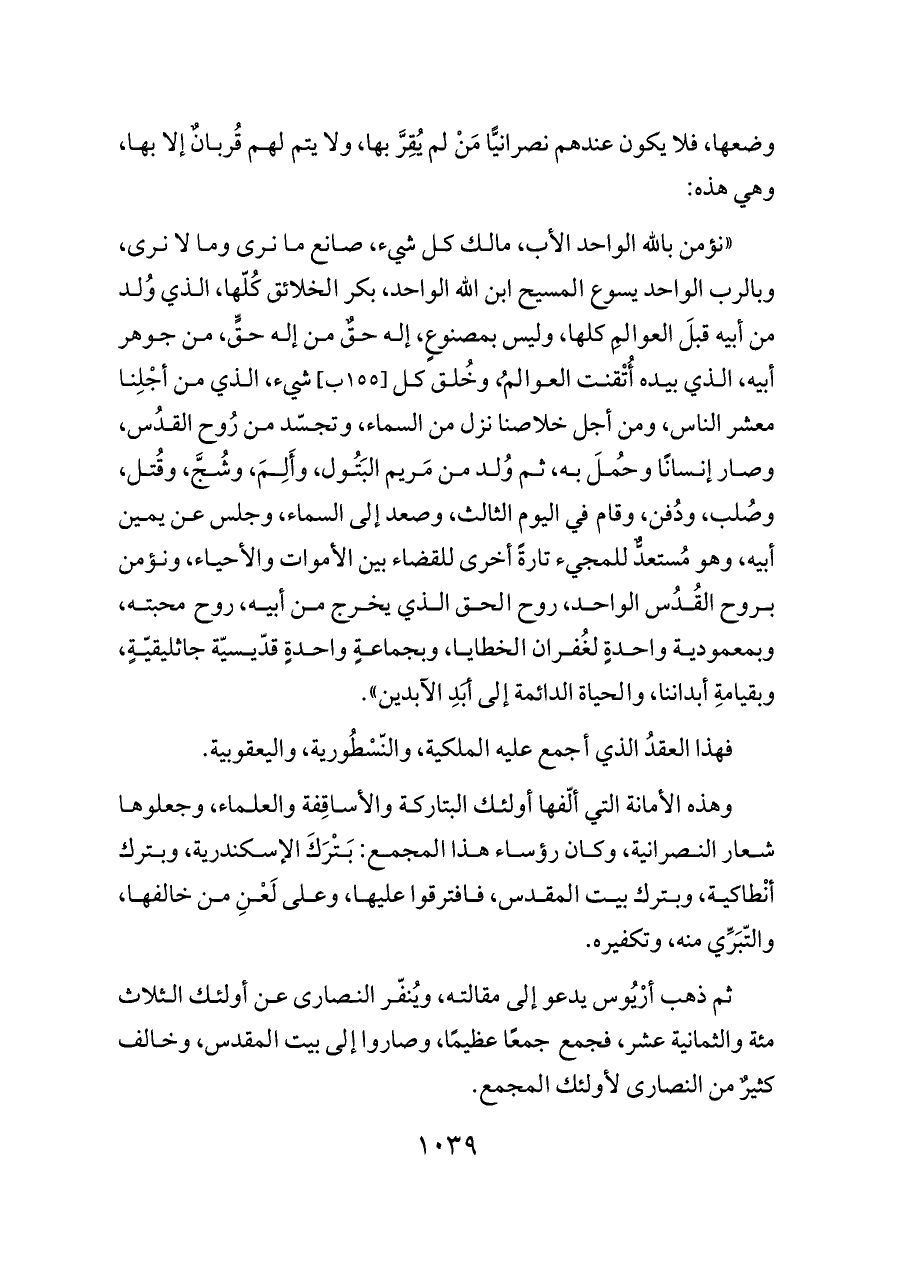 «نؤمن بالله الواحد الأب، مالك كل شيء، صانع ما نرى وما لا نرى، وبالرب الواحد يسوع المسيح ابن الله الواحد، بكر الخلائق كُلّها، الذي وُلد من أبيه قبلَ العوالِم كلها، وليس بمصنوعٍ، إله حقٌ من إله حقٍّ، من جوهر أبيه، الذي بيده أُتْقنت العوالمُ، وخُلق كل [١٥٥ ب] شيء، الذي من أجْلِنا معشر الناس، ومن أجل خلاصنا نزل من السماء، وتجسّد من رُوح القدُس، وصار إنسانًا وحُملَ به، ثم وُلد من مَريم البَتُول، وأَلِمَ، وشُجَّ، وقُتل، وصُلب، ودُفن، وقام في اليوم الثالث، وصعد إلى السماء، وجلس عن يمين أبيه، وهو مُستعدٌّ للمجيء تارةً أخرى للقضاء بين الأموات والأحياء، ونؤمن بروح القُدُس الواحد، روح الحق الذي يخرج من أبيه، روح محبته، وبمعمودية واحدةٍ لغُفران الخطايا، وبجماعةٍ واحدةٍ قدّيسيّة جاثليقيّةٍ، وبقيامةِ أبداننا، والحياة الدائمة إلى أبَدِ الآبدين».