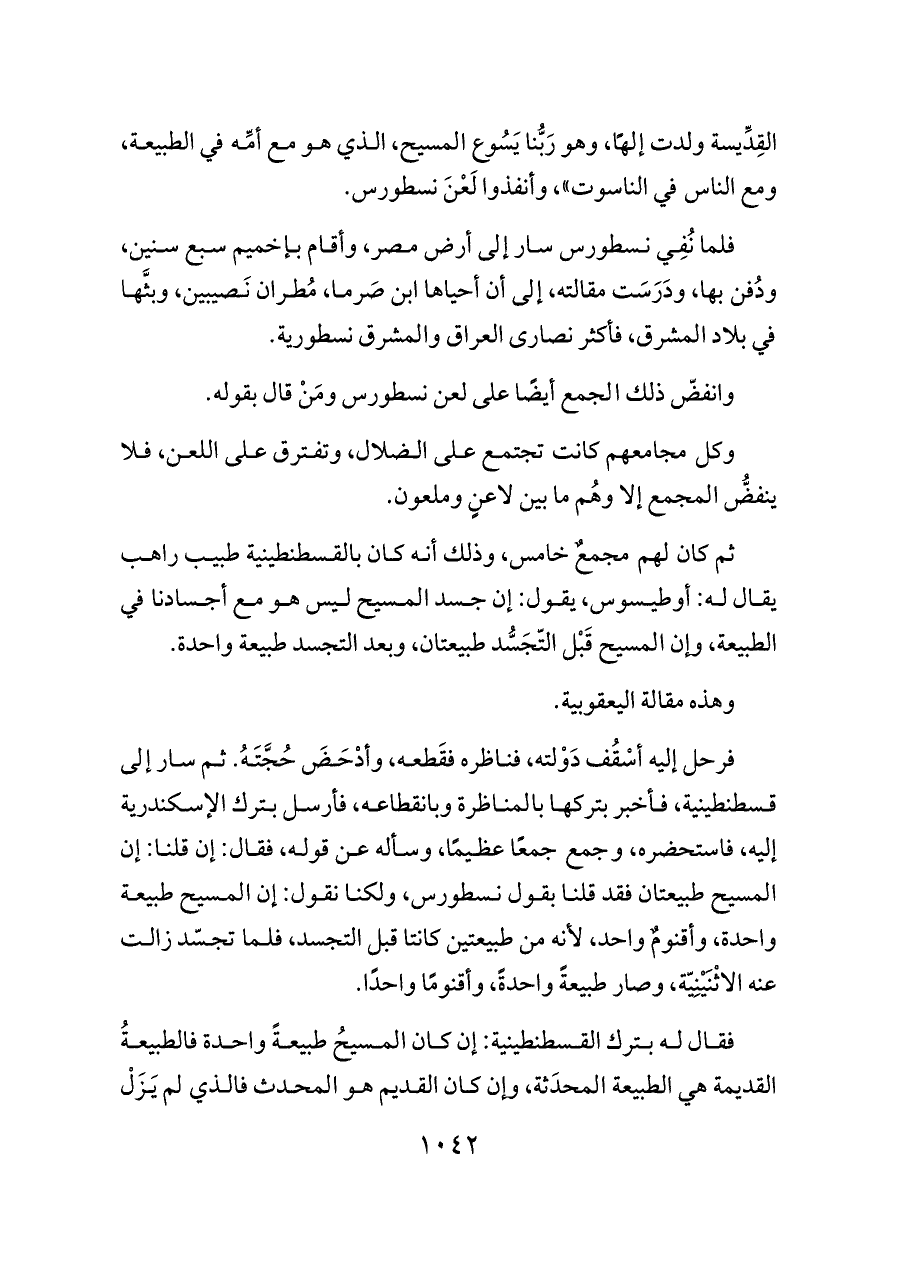 فقال له بترك القسطنطينية: إن كان المسيحُ طبيعةً واحدة فالطبيعةُ القديمة هي الطبيعة المحدَثة، وإن كان القديم هو المحدث فالذي لم يَزَلْ