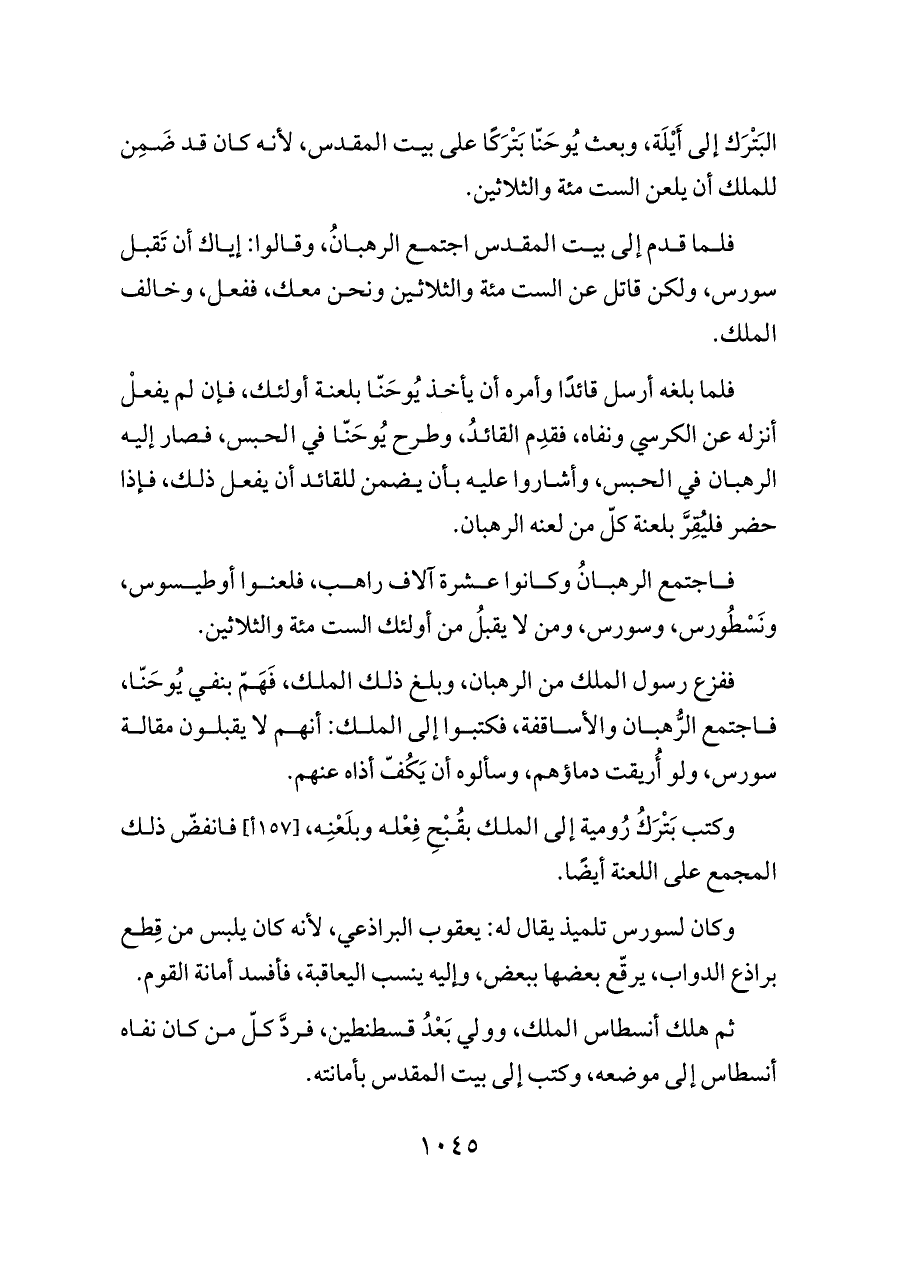 فلما بلغه أرسل قائدًا وأمره أن يأخذ يُوحَنّا بلعنة أولئك، فإن لم يفعلْ أنزله عن الكرسي ونفاه، فقدِم القائدُ، وطرح يُوحَنّا في الحبس، فصار إليه الرهبان في الحبس، وأشاروا عليه بأن يضمن للقائد أن يفعل ذلك، فإذا حضر فليُقِرَّ بلعنة كلّ من لعنه الرهبان.