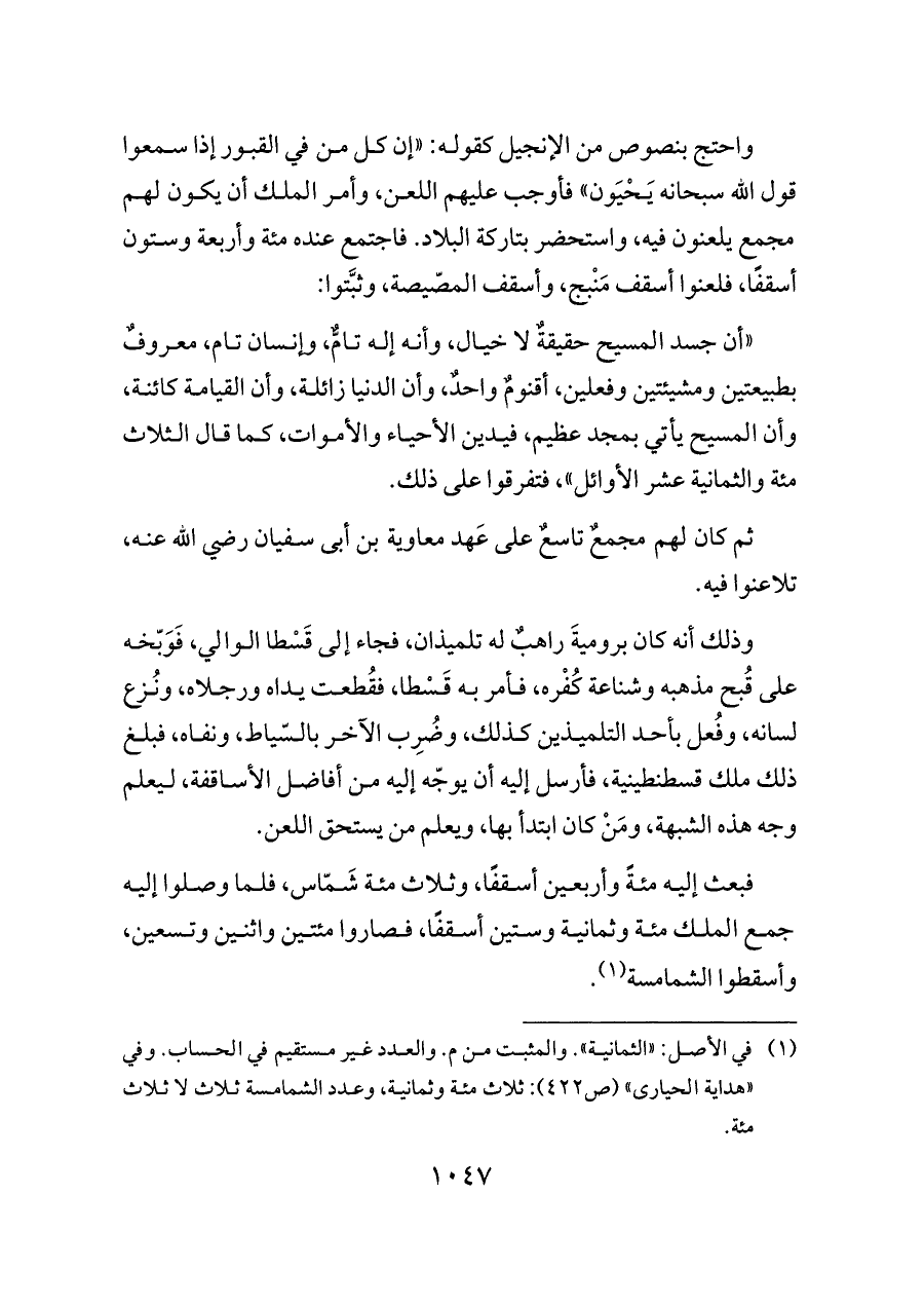 واحتج بنصوص من الإنجيل كقوله: «إن كل من في القبور إذا سمعوا قول الله سبحانه يَحْيَون» فأوجب عليهم اللعن، وأمر الملك أن يكون لهم مجمع يلعنون فيه، واستحضر بتاركة البلاد. فاجتمع عنده مئة وأربعة وستون أسقفًا، فلعنوا أسقف مَنْبج، وأسقف المصّيصة، وثبَّتوا: