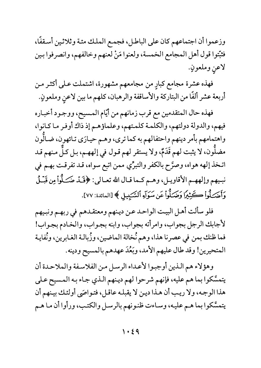 فهذه حال المتقدمين مع قرب زمانهم من أيّام المسيح، ووجود أخباره فيهم، والدولة دولتهم، والكلمة كلمتهم، وعلماؤهم إذ ذاك أوفر ما كانوا، واهتمامهم بأمر دينهم واحتفالهم به كما ترى، وهم حيارَى تائهون، ضالُّون مضلُّون، لا يثبت لهم قَدَمٌ، ولا يستقر لهم قول في إلههم، بل كلٌّ منهم قد اتخذ إلهه هواه، وصرَّح بالكفر والتبرِّي ممن اتبع سواه، قد تفرقت بهم في نبيهم وإلههم الأقاويل، وهم كما قال الله تعالى: {قَدْ ضَلُّوا مِنْ قَبْلُ وَأَضَلُّوا كَثِيرًا وَضَلُّوا عَنْ سَوَاءِ السَّبِيلِ} [المائدة: ٧٧].