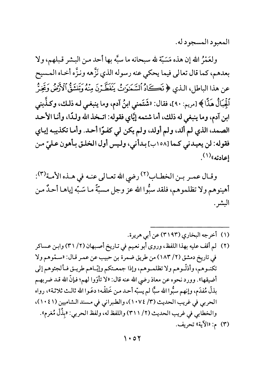 ولعَمْرُ الله إن هذه مَسَبّة لله سبحانه ما سبَّه بها أحد من البشر قبلهم، ولا بعدهم، كما قال تعالى فيما يحكي عنه رسوله الذي نَزَّهه ونزَّه أخاه المسيح عن هذا الباطل، الذي {تَكَادُ السَّمَاوَاتُ يَتَفَطَّرْنَ مِنْهُ وَتَنْشَقُّ الْأَرْضُ وَتَخِرُّ الْجِبَالُ هَدًّا} [مريم: ٩٠]، فقال: «شَتَمني ابنُ آدم، وما ينبغي له ذلك، وكذَّبني ابن آدم، وما ينبغي له ذلك، أما شتمه إيَّاي فقوله: اتخذ الله ولدًا، وأنا الأحد الصمد، الذي لم ألد، ولم أولد، ولم يكن لي كفوًا أحد. وأما تكذيبه إياي فقوله: لن يعيدني كما [١٥٨ ب] بدأني، وليس أول الخلق بأهون عليّ من إعادته» (¬١).