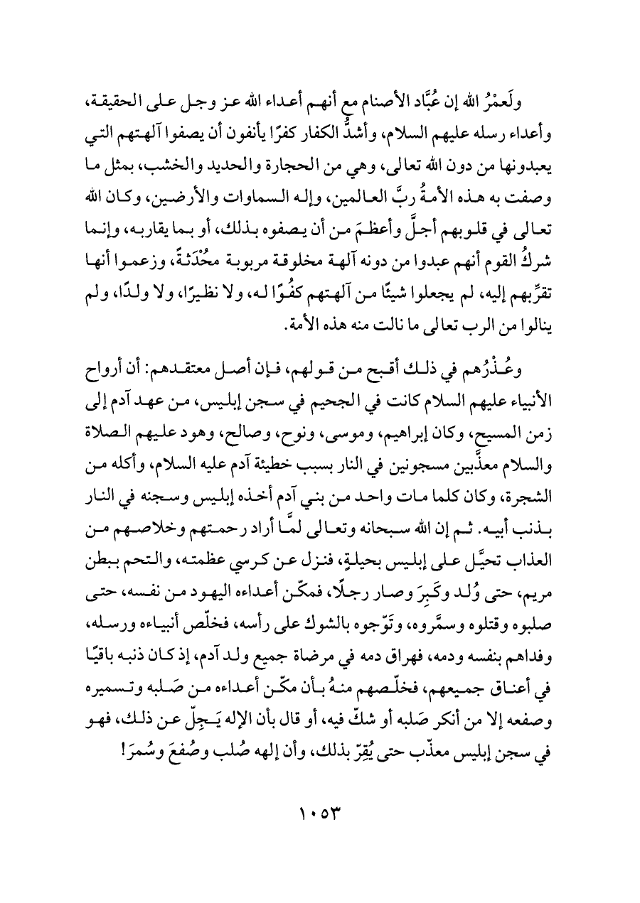 ولَعمْرُ الله إن عُبَّاد الأصنام مع أنهم أعداء الله عز وجل على الحقيقة، وأعداء رسله عليهم السلام، وأشدُّ الكفار كفرًا يأنفون أن يصفوا آلهتهم التي يعبدونها من دون الله تعالى، وهي من الحجارة والحديد والخشب، بمثل ما وصفت به هذه الأمةُ ربَّ العالمين، وإله السماوات والأرضين، وكان الله تعالى في قلوبهم أجلَّ وأعظمَ من أن يصفوه بذلك، أو بما يقاربه، وإنما شركُ القوم أنهم عبدوا من دونه آلهة مخلوقة مربوبة مُحْدَثةً، وزعموا أنها تقرِّبهم إليه، لم يجعلوا شيئًا من آلهتهم كفُوًا له، ولا نظيرًا، ولا ولدًا، ولم ينالوا من الرب تعالى ما نالت منه هذه الأمة.