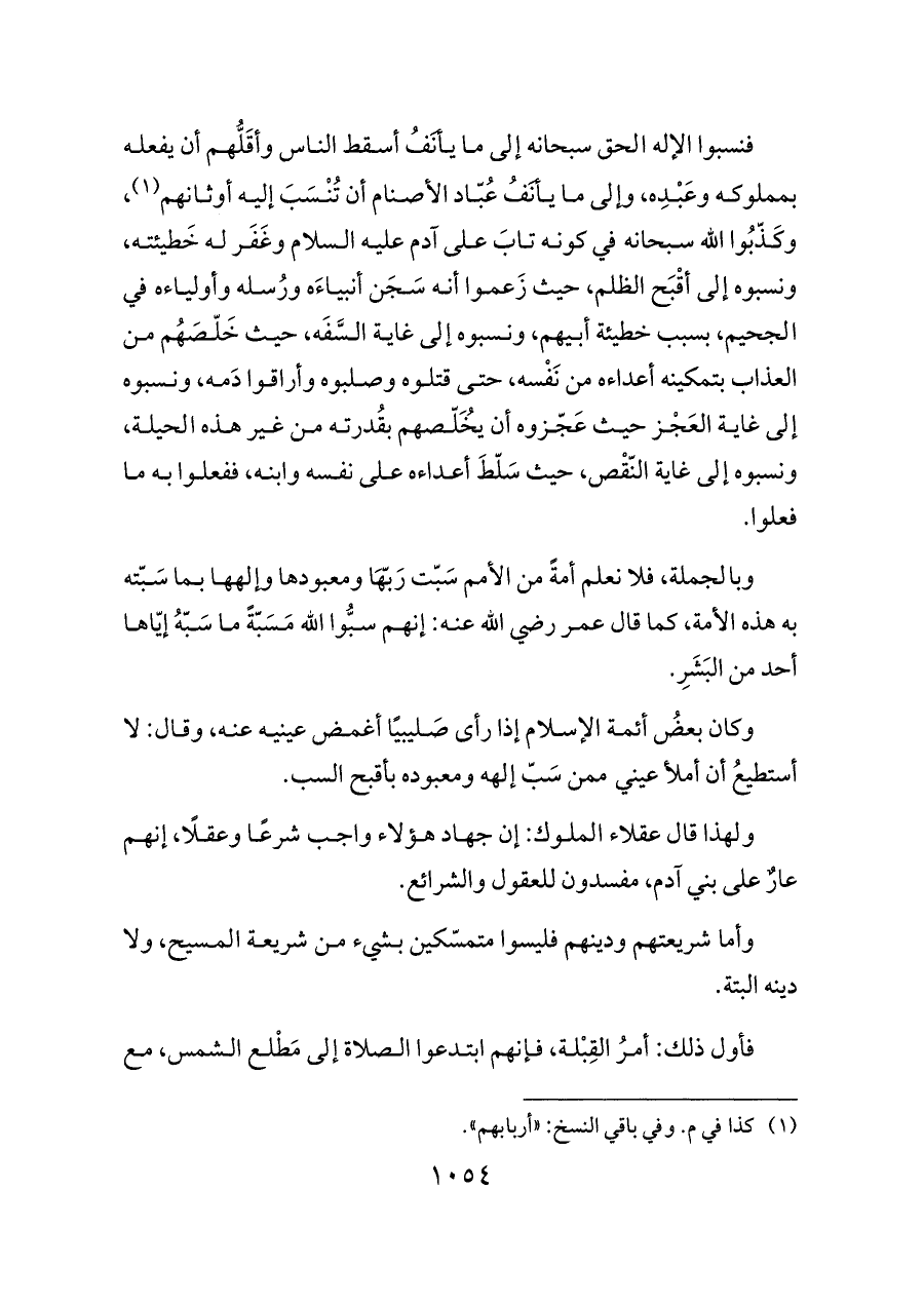 وبالجملة، فلا نعلم أمةً من الأمم سَبّت رَبّهَا ومعبودها وإلهها بما سَبّته به هذه الأمة، كما قال عمر رضي الله عنه: إنهم سبُّوا الله مَسَبّةً ما سَبّهُ إيّاها أحد من البَشَرِ.