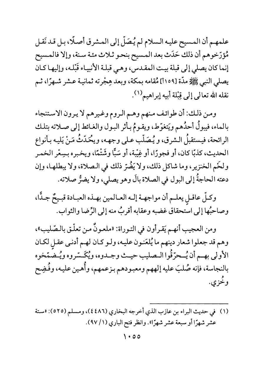 علمهم أن المسيح عليه السلام لم يُصَلّ إلى المشرق أصلًا، بل قد نَقل مُؤرّخوهم أن ذلك حَدَث بعد المسيح بنحو ثلاث مئة سنة، وإلا فالمسيح إنما كان يصلي إلى قبلة بيت المقدس، وهي قبلة الأنبياء قَبْله، وإليها كان يصلي النبي - صلى الله عليه وسلم - مدّة [١٥٩ أ] مُقامه بمكة، وبعد هِجْرته ثمانية عشر شهرًا، ثم نقله الله تعالى إلى قِبْلة أبيه إبراهيم (¬١).