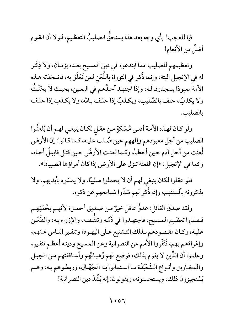 ولو كان لهذه الأمة أدنى مُسْكةٍ من عقلٍ لكان ينبغي لهم أن يَلعنُوا الصليب من أجل معبودهم وإلههم حين صُلب عليه، كما قالوا: إن الأرض لُعنت من أجل آدم حين أخطأ، وكما لعنت الأرضُ حين قتل قابيلُ أخاه، وكما في الإنجيل: «إن اللعنة تنزل على الأرض إذا كان أمراؤها الصبيان».